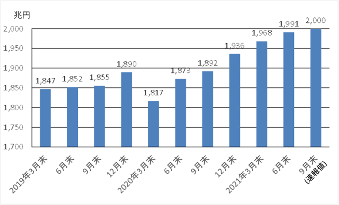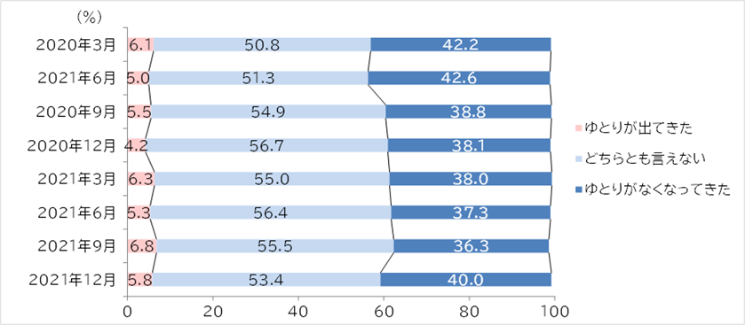 可処分所得は新型コロナの感染拡大が始まった2020年以降、前年の反動があった2021年4~6月を除くとプラスで推移しています。家計金融資産は2020年3月末を底に増加の一途をたどり、2021年9月末時点で2,000兆円に迫る勢いとなっています(図表4、5)。先行き不透明な景況感に貯蓄意識が高まるとともに、2020年10月~12月のGoToトラベルキャンペーンの実施期間は消費支出が伸びていたことから、外出や旅行に関わる消費が感染拡大で抑えられていると考えられ、感染状況が落ち着けば、今後の旅行消費に期待が高まります。一方で、暮らし向き(ゆとり)については2021年9月まで「ゆとりがなくなった」が減少傾向を示していたものの、12月に増加に転じており、今後の消費への影響が不安視されます(図表6)。
