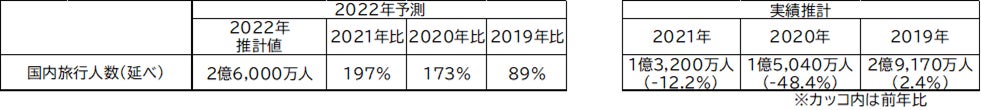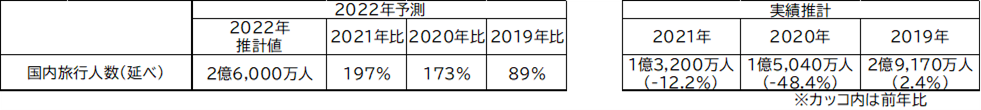 2022年の旅行市場として国内旅行者数は、国や行政による緊急事態宣言やまん延防止等重点措置などの発出が早期終了し、ある程度感染症が抑制された状況が続いた場合2億6,000万人(2021年比97%増、2020年比73%増、2019年比11%減)と推計します。なお、消費額は算出しませんが、新型コロナの感染状況が落ち着いた状況が続けば、旅行日数は長くなり、また、遠方への国内旅行が増加するので、単価が上がり、総額は高くなります。