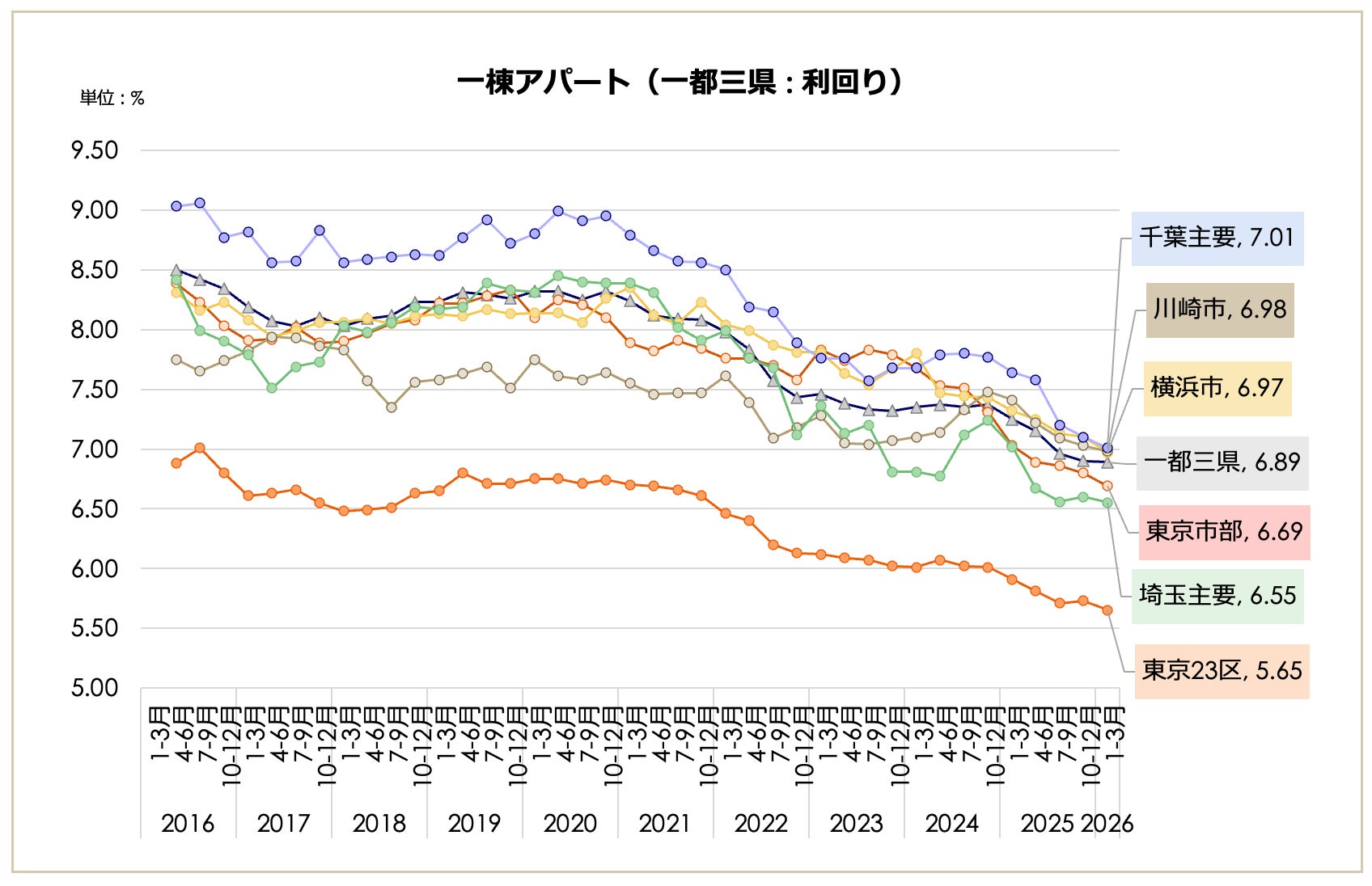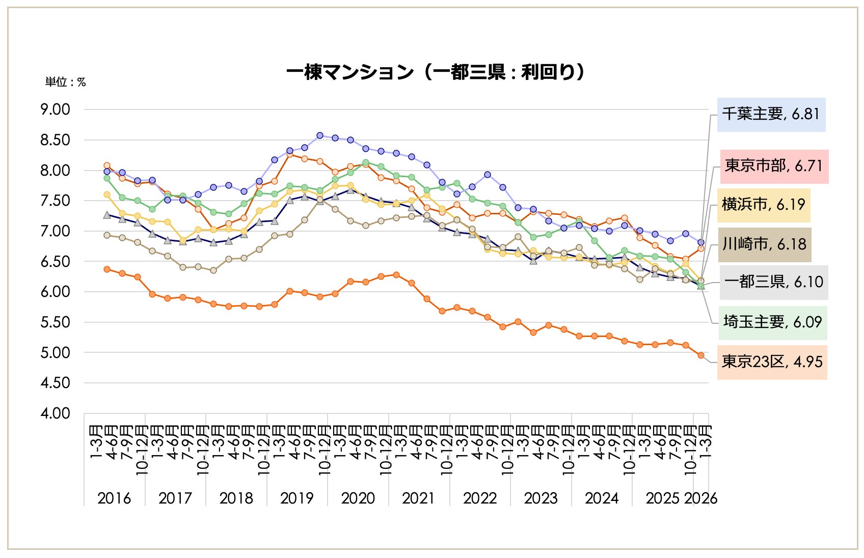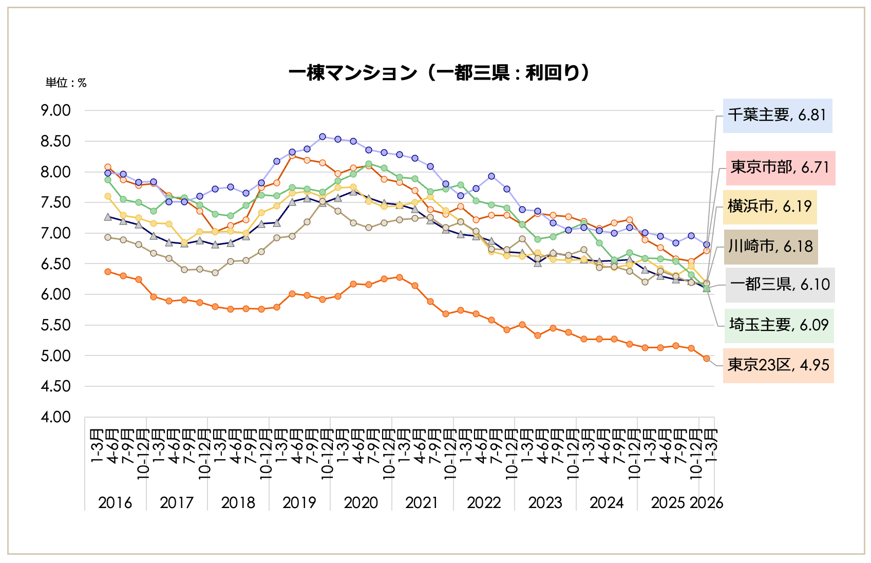 埼玉主要都市の価格が2億9,211万円(前期比+21.77%)と急伸し3億円に迫る。福岡市の利回りは6.02%まで圧縮され、一都三県平均(6.10%)を下回るなど、特定主要都市への投資の加速がうかがえる。