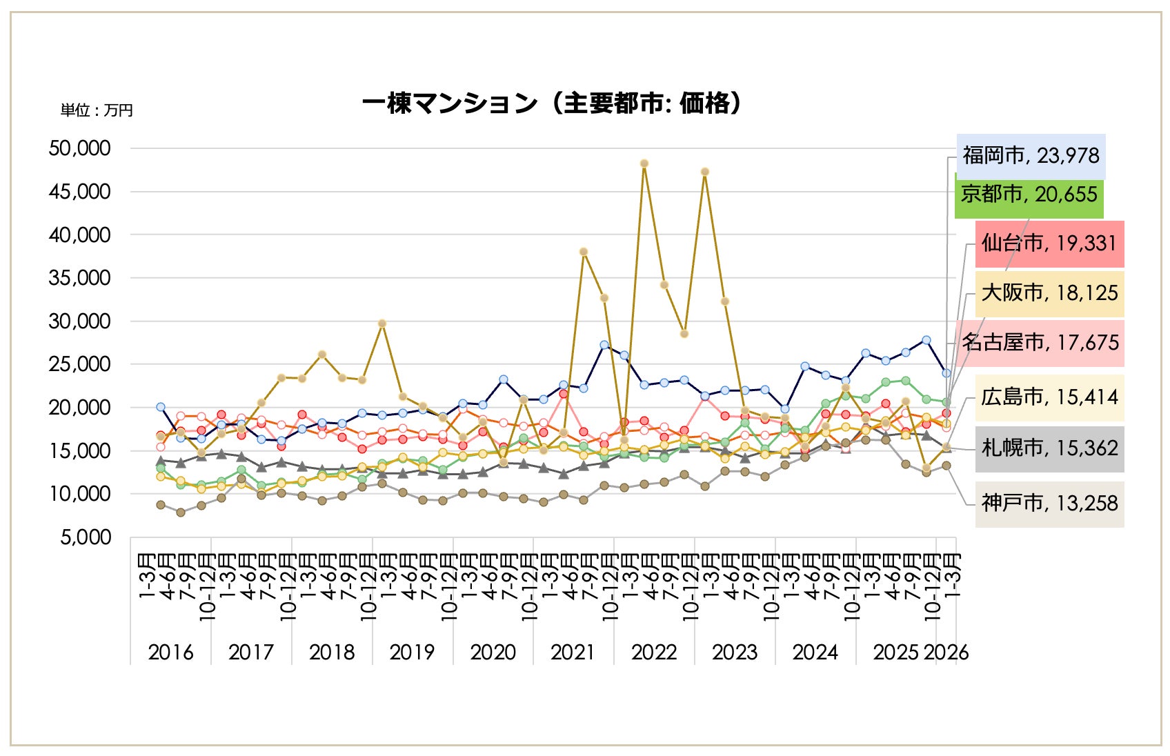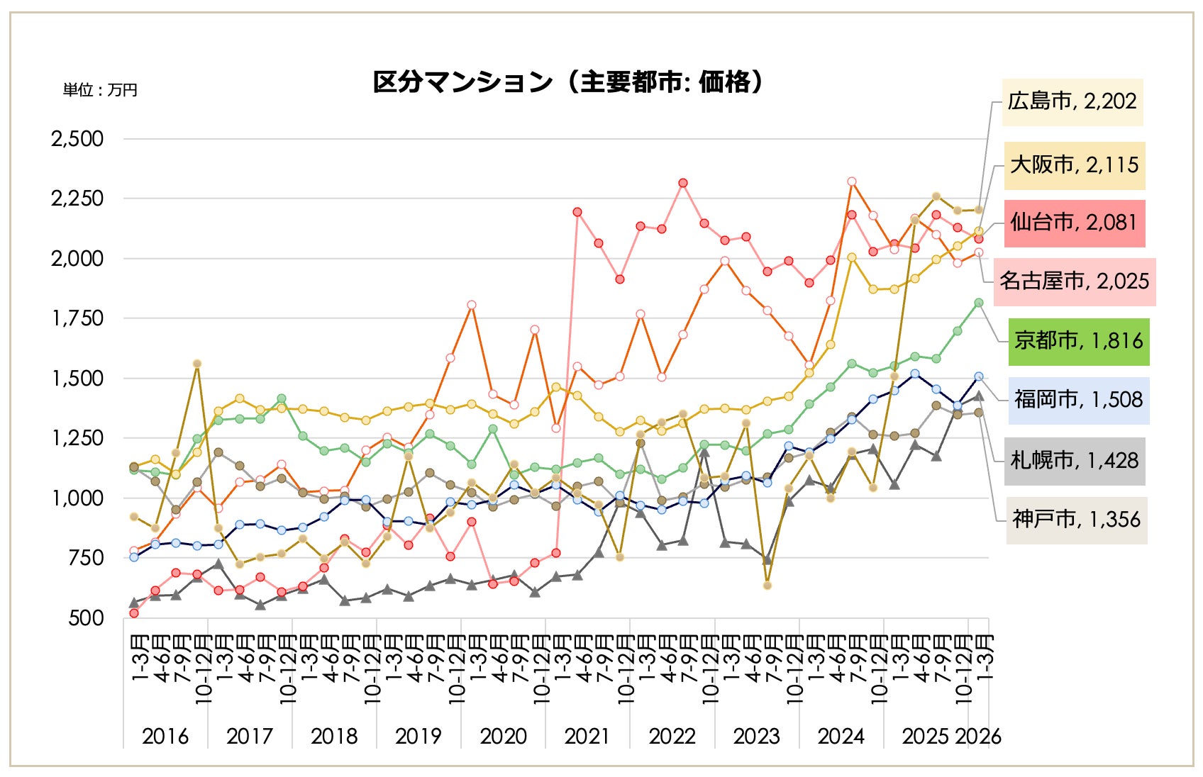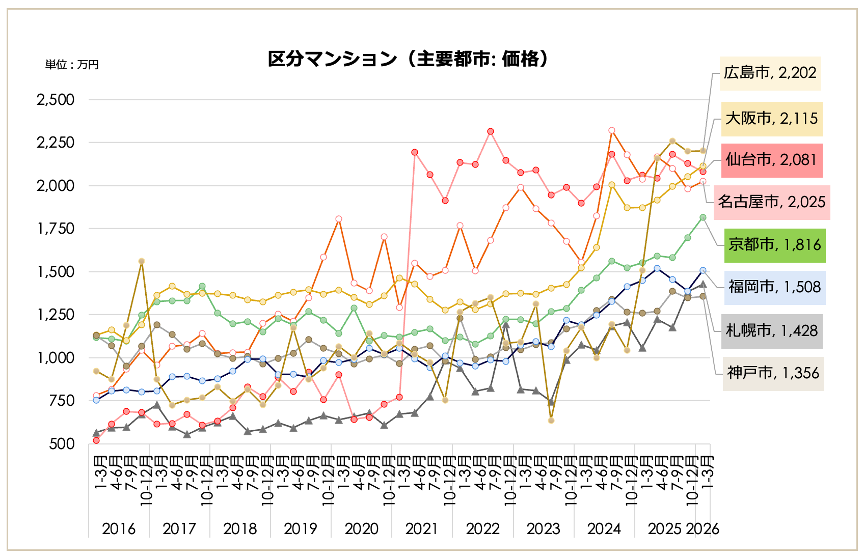 一都三県・主要都市別の動向を見ると、一都三県(3,007万円、前期比2.24%減)や東京23区(3,687万円、同1.76%減)が下落に転じた一方で、主要地方都市は上昇を見せています。大阪市(2,115万円)、京都市(1,816万円)、福岡市(1,508万円)などは上昇トレンドを維持しており、一都三県・23区の下落と地方主要都市の上昇で動きが分かれる結果となりました。