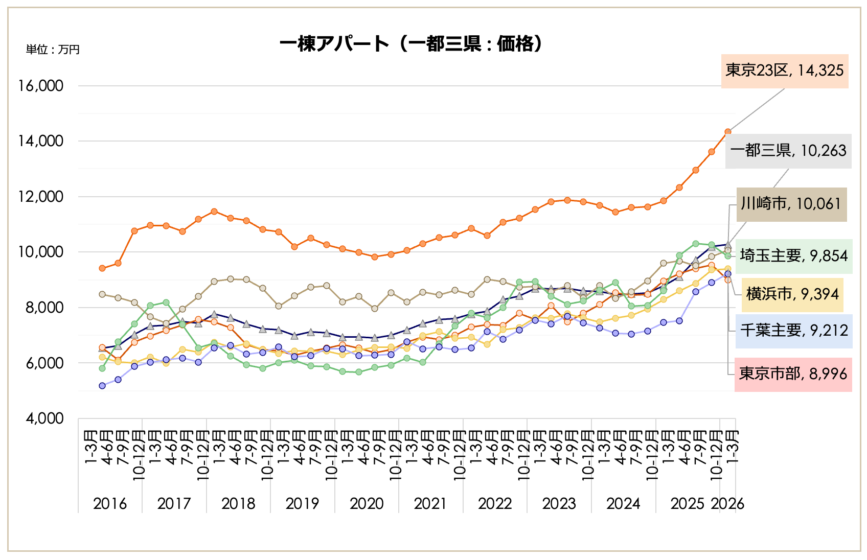 全種別で過去最高値圏を維持。一棟マンションは2億416万円、一棟アパートは9,027万円といずれも過去最高値を更新し、市場全体の底上げ傾向が続いている。