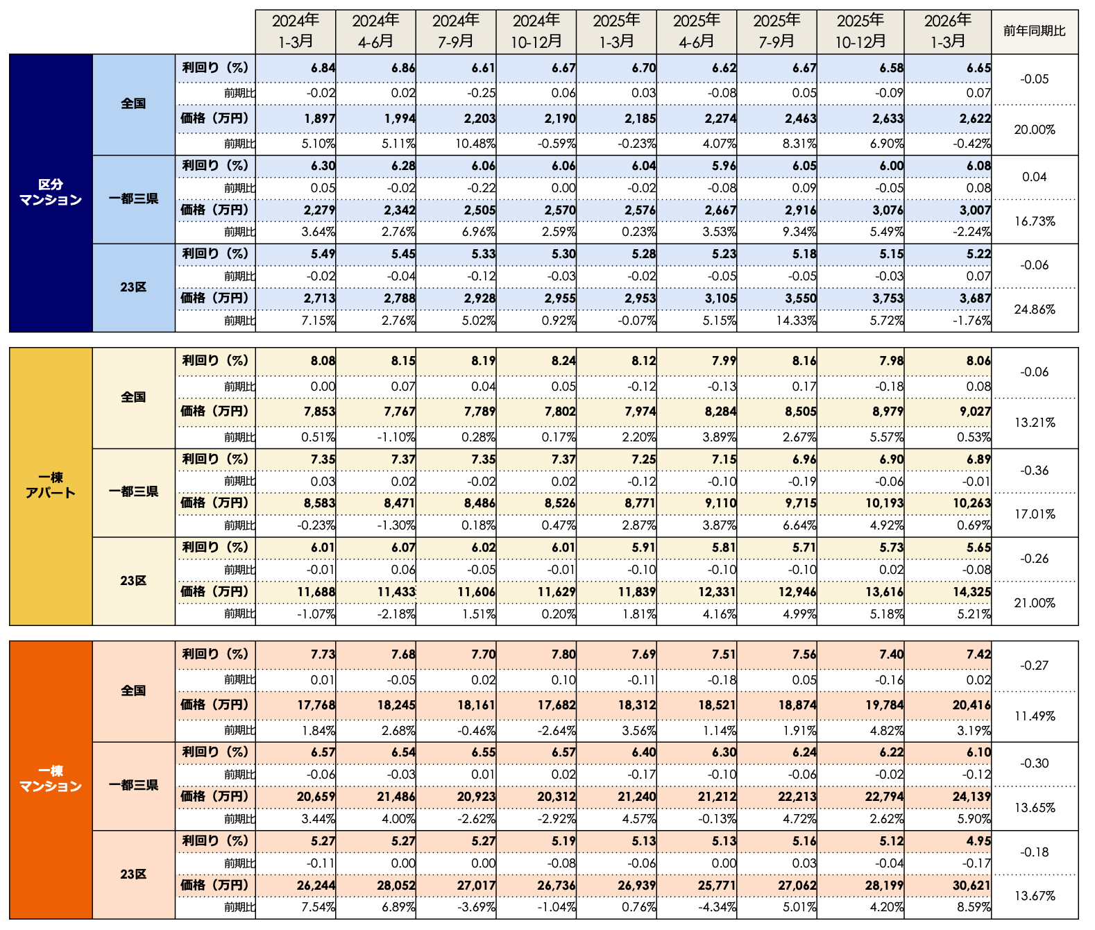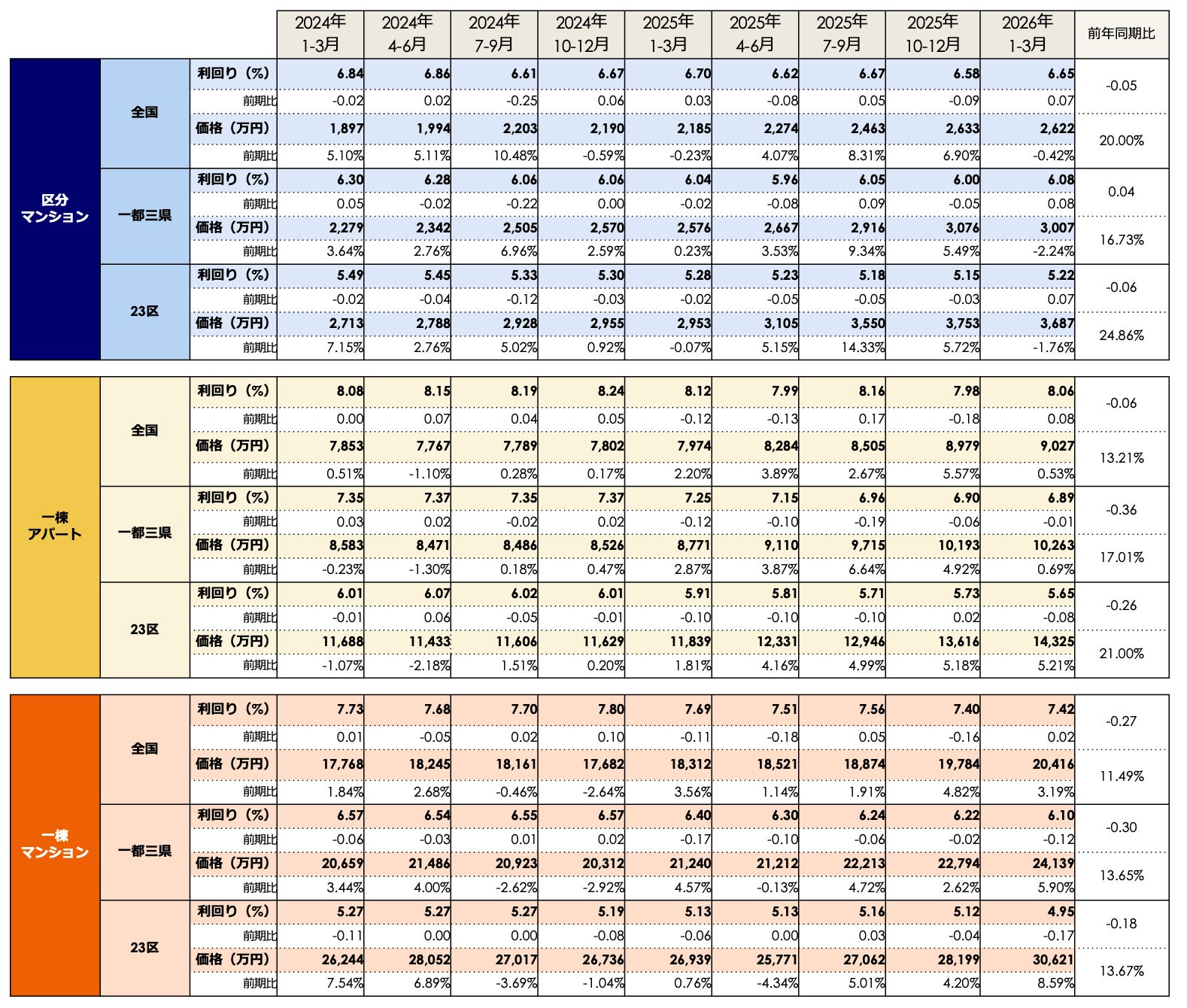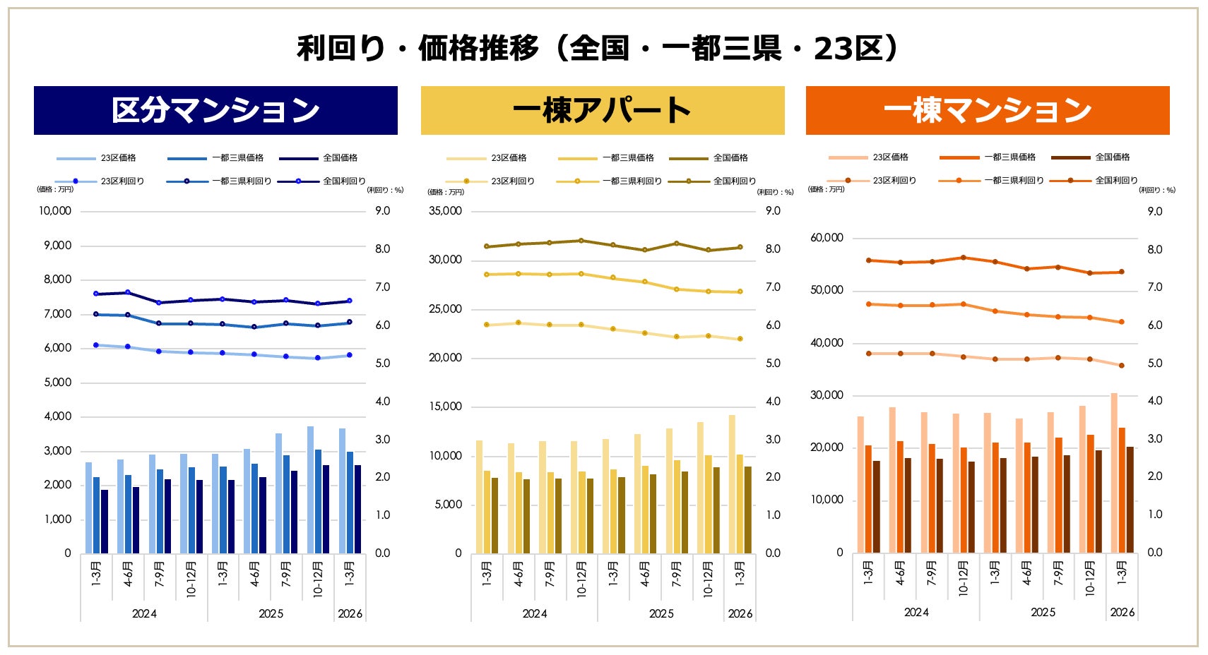 2026年1月1日~3月31日に健美家で登録された全国の住宅系収益不動産3種別(区分マンション・一棟アパート・一棟マンション)