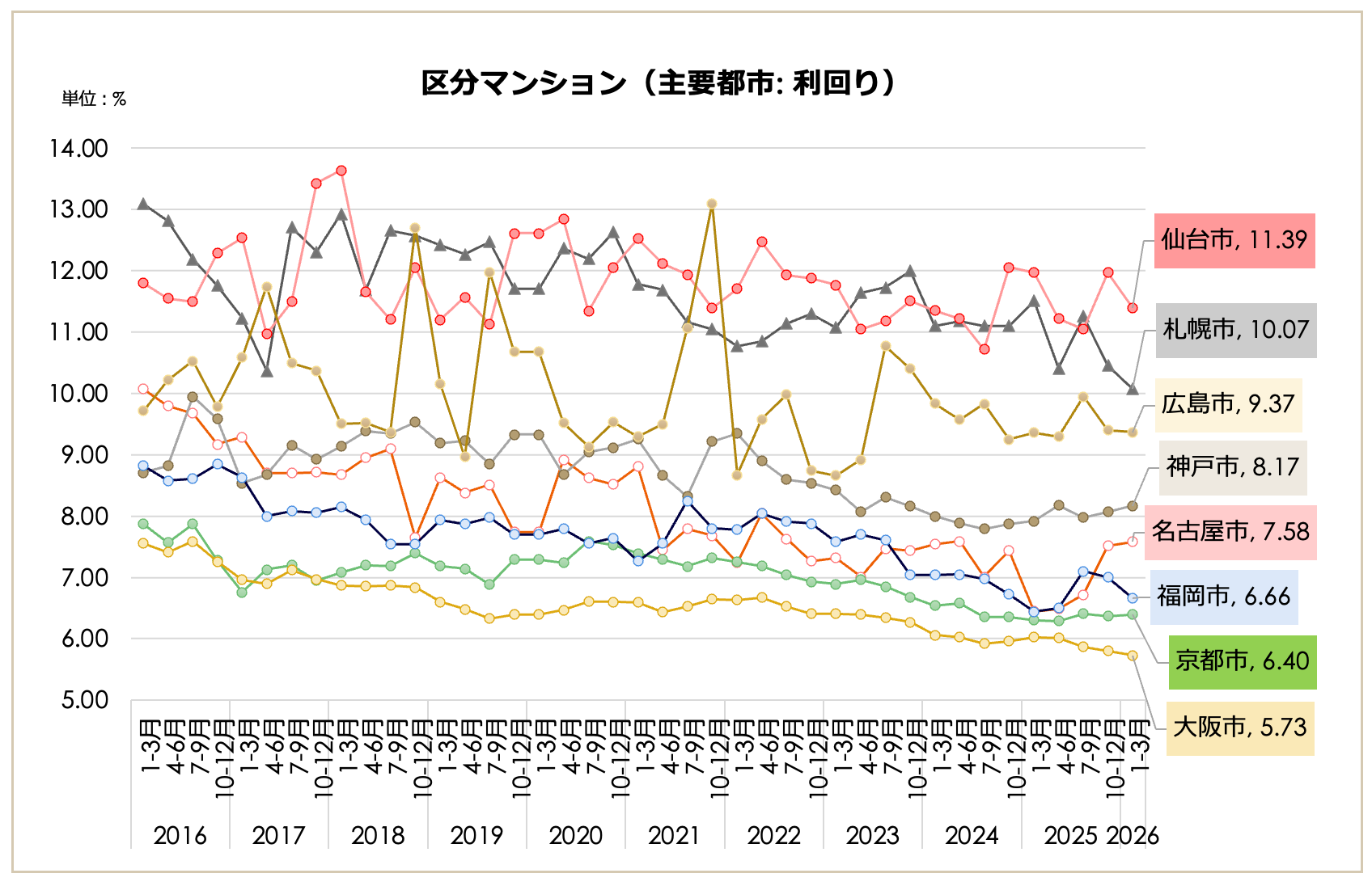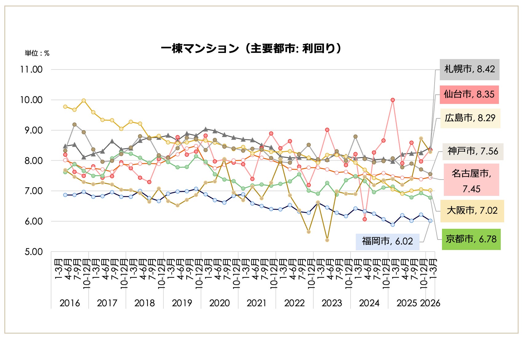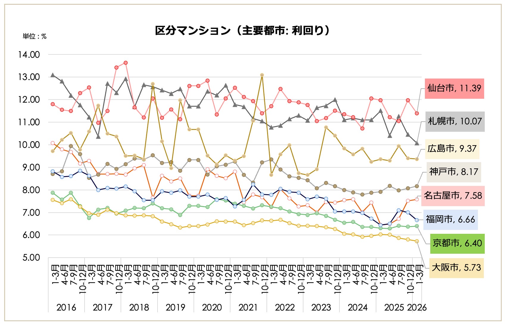 築年別の動きでは、東京23区の「築10年未満」利回りが5.27%、「築20年以上」でも6.14%に留まり、その差は0.87ポイントとなりました。広島市(10.63ポイント差)や神戸市(6.24ポイント差)など、築年数によって利回りが大きく変動する地方主要都市と比較して、23区は築年数を経ても資産価値が落ちにくい傾向が顕著となっています。