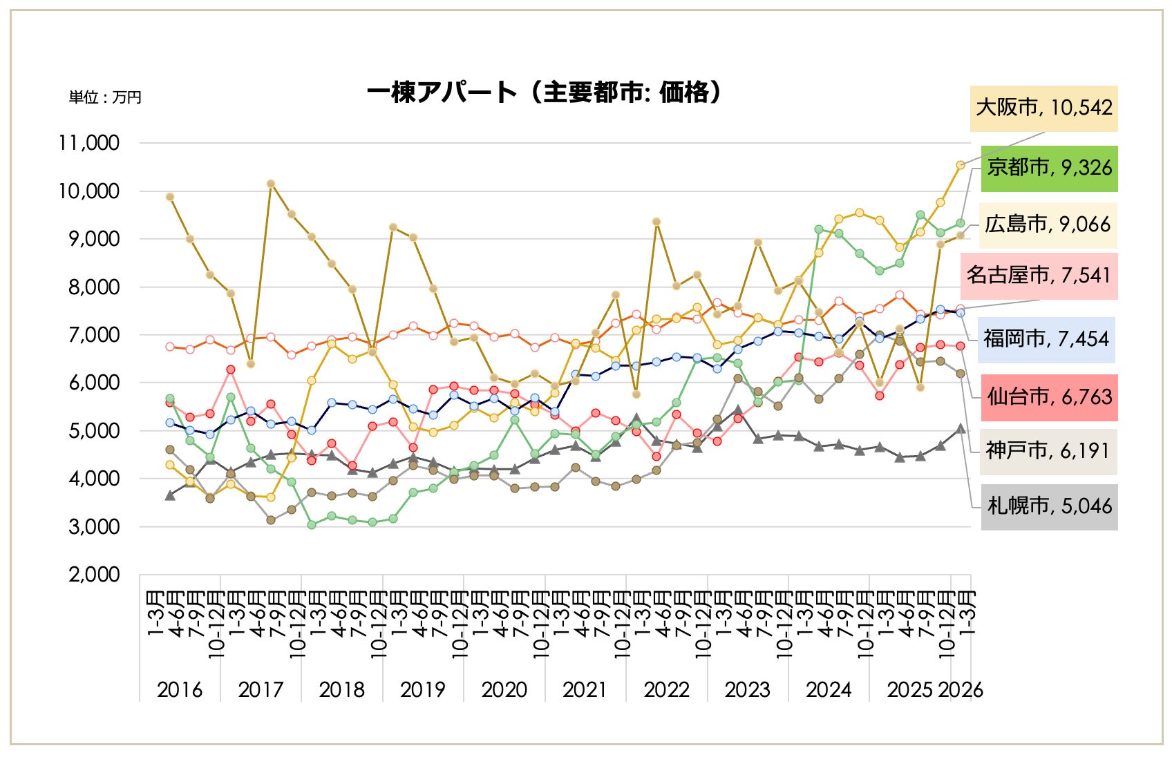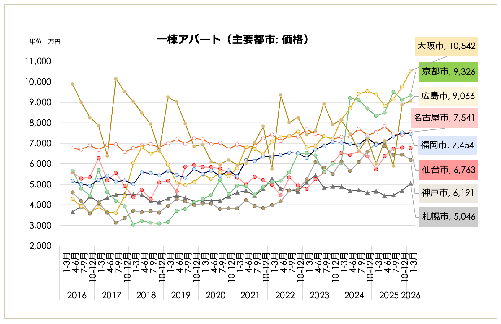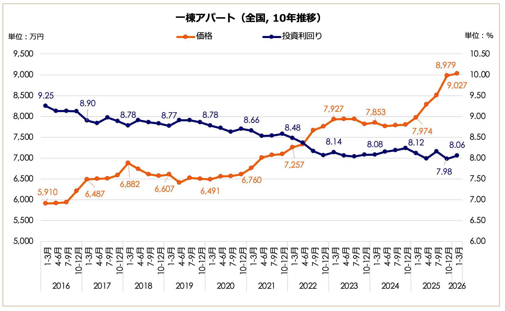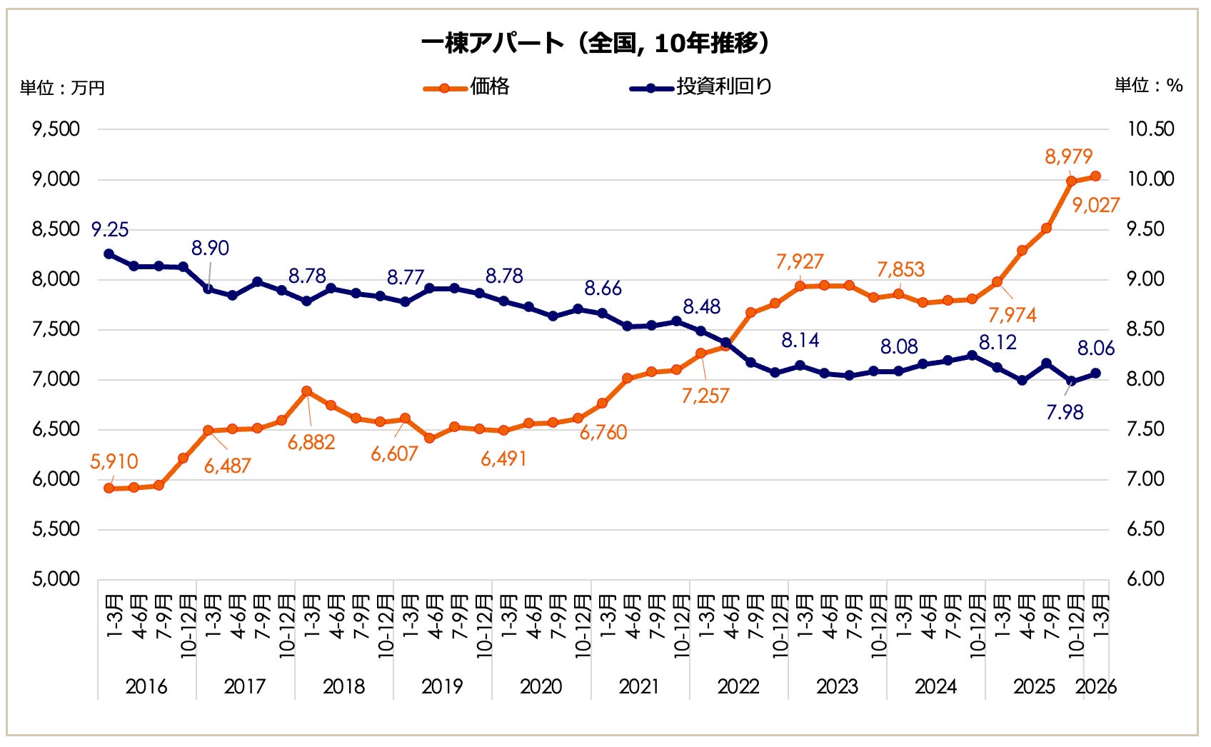 2026年1月〜3月期における全国の一棟アパート価格は9,027万円となり、前期比で0.53%上昇しました。上昇トレンドを維持したまま、10年前(2016年1-3月期:5,910万円)の約1.53倍となる過去最高値を更新しています。表面利回りは8.06%となり、前期(7.98%)から0.08ポイントの微増となったものの、長期推移では依然として過去10年間で最低圏の低水準にあります。