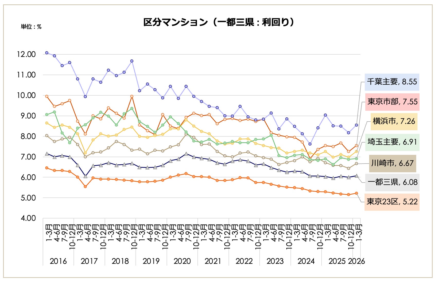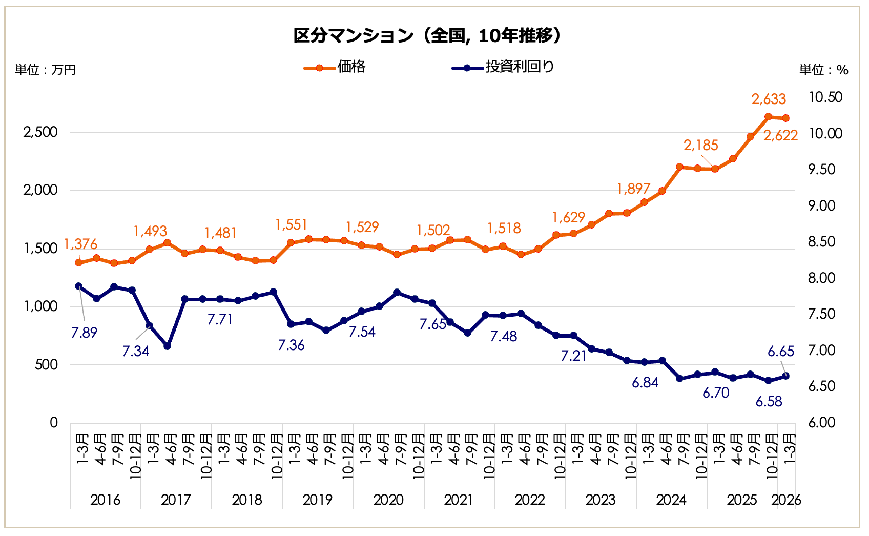 2026年1月〜3月期における全国の区分マンション価格は2,622万円となり、前期比で0.42%減少しました。微減となったものの、10年前(2016年1-3月期:1,376万円)の約1.9倍にあたる高値圏を維持しています。表面利回りは6.65%(前期6.58%)となり、長期の低下傾向が止まり、横ばいでの推移となりました。