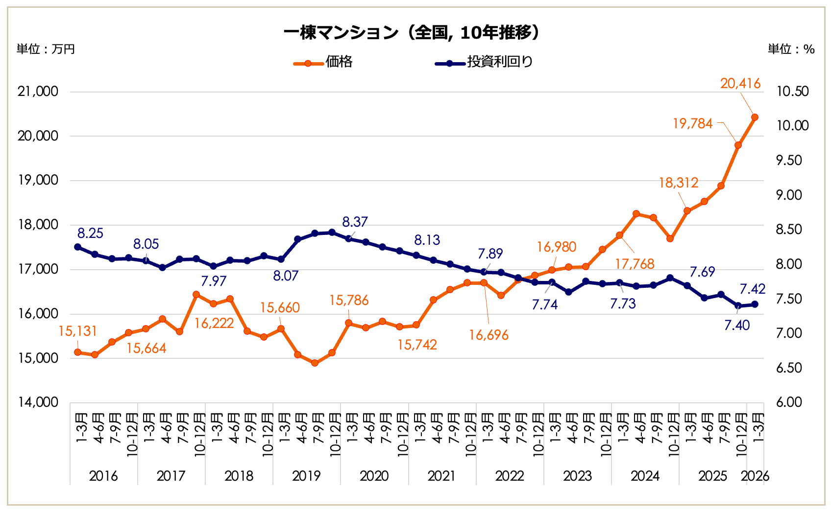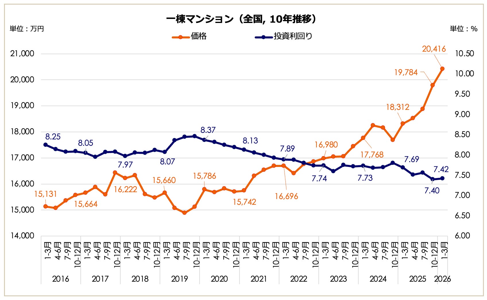 2026年1月〜3月期における全国の一棟マンション価格は2億416万円となり、前期(1億9,784万円)から上昇して2億円の大台に乗り、前年同期(1億8,312万円)と比較しても11.49%の価格増となっています。表面利回りは7.42%となり、前期(7.40%)から0.02ポイントの微増となったものの、前年同期(7.69%)を下回る低水準での推移が継続しています。