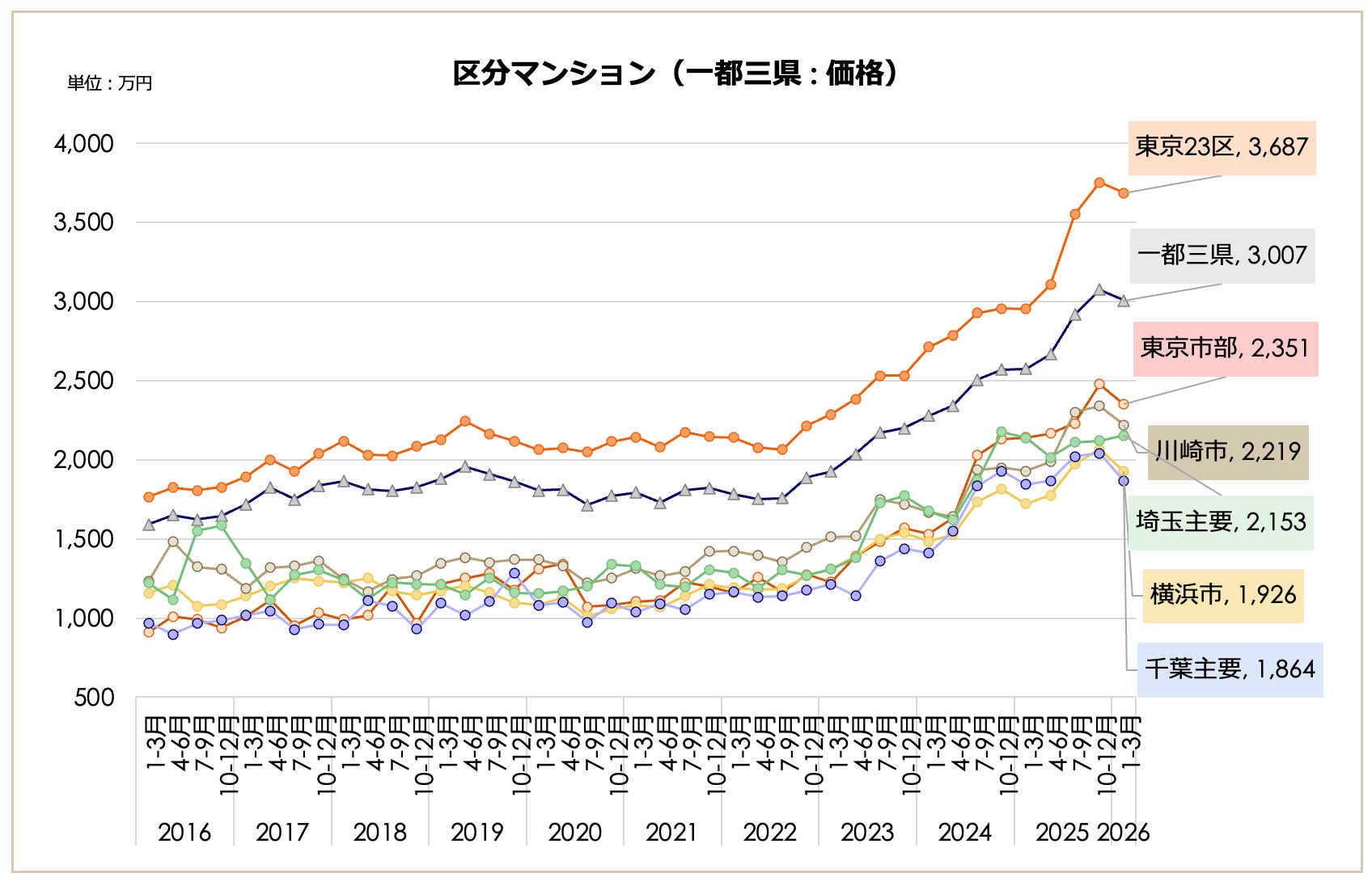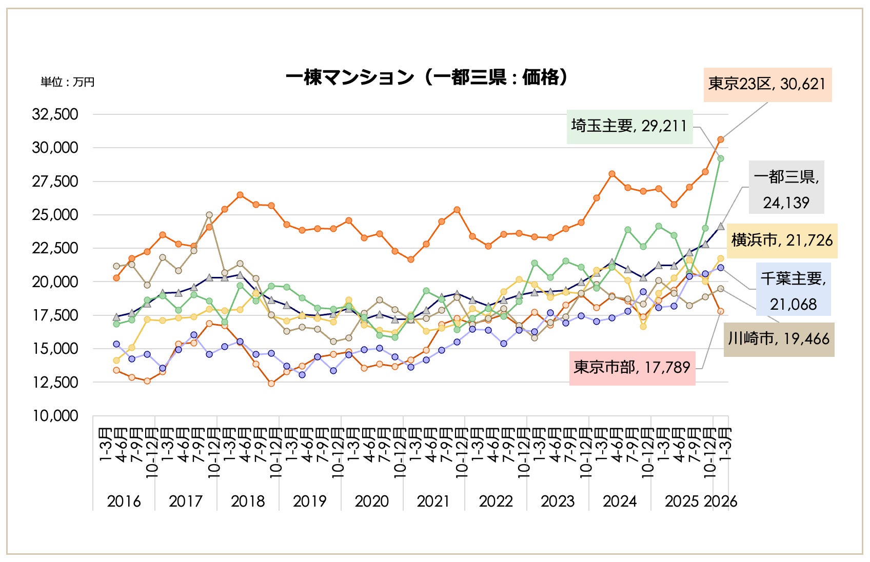 【一都三県・主要都市別】東京23区が3億円台、埼玉主要都市が2.9億円台へ急伸