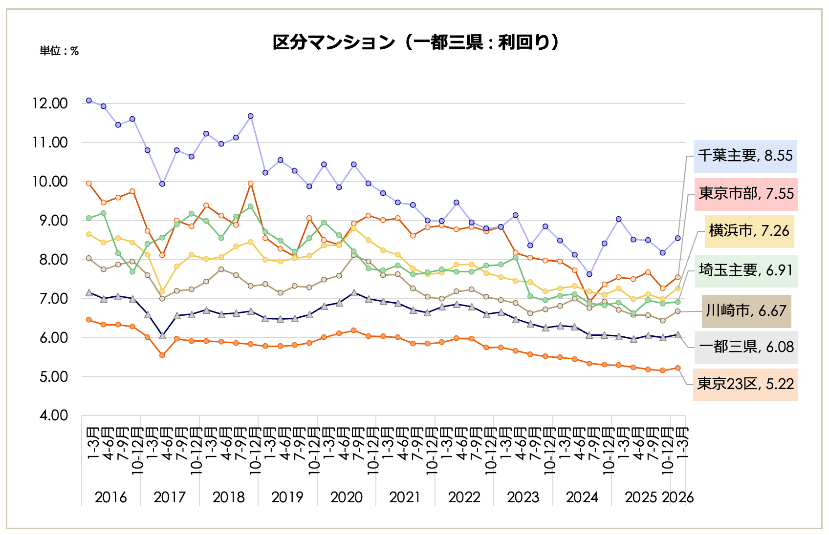 一都三県(3,007万円、前期比2.24%減)や東京23区(3,687万円、同1.76%減)が下落に転じたが、大阪市(2,115万円)や福岡市(1,508万円)などの主要都市では上昇トレンドを維持。一方で、23区の「築10年未満」利回りは3.74%まで低下し、依然として買い手の高値許容度は極めて高い状態にある。