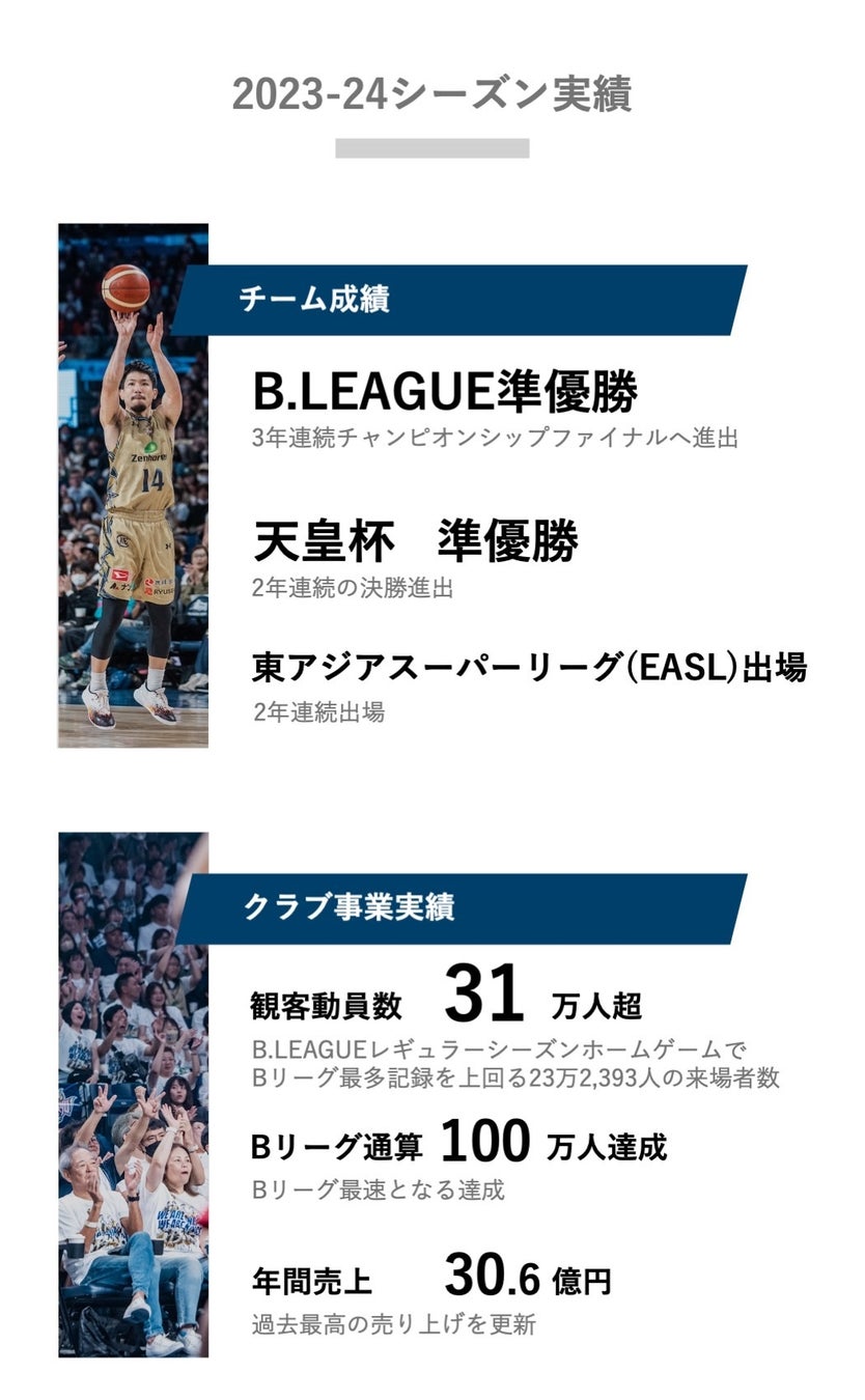 チーム成績としては、他クラブが競争力を増す中で、B.LEAGUE2023-24シーズンで7大会連続のチャンピオンシップ進出、6大会連続のセミファイナル進出、そして3年連続3回目のファイナル進出を成し遂げました。さらに、天皇杯では2年連続で準優勝、東アジアスーパーリーグ(EASL)にも2年連続で出場するなど、充実した一年を過ごすことができました。これらの成果は、キングスに関わるすべての皆さまの支えがあったからこそ達成できたものと深く感謝しております。