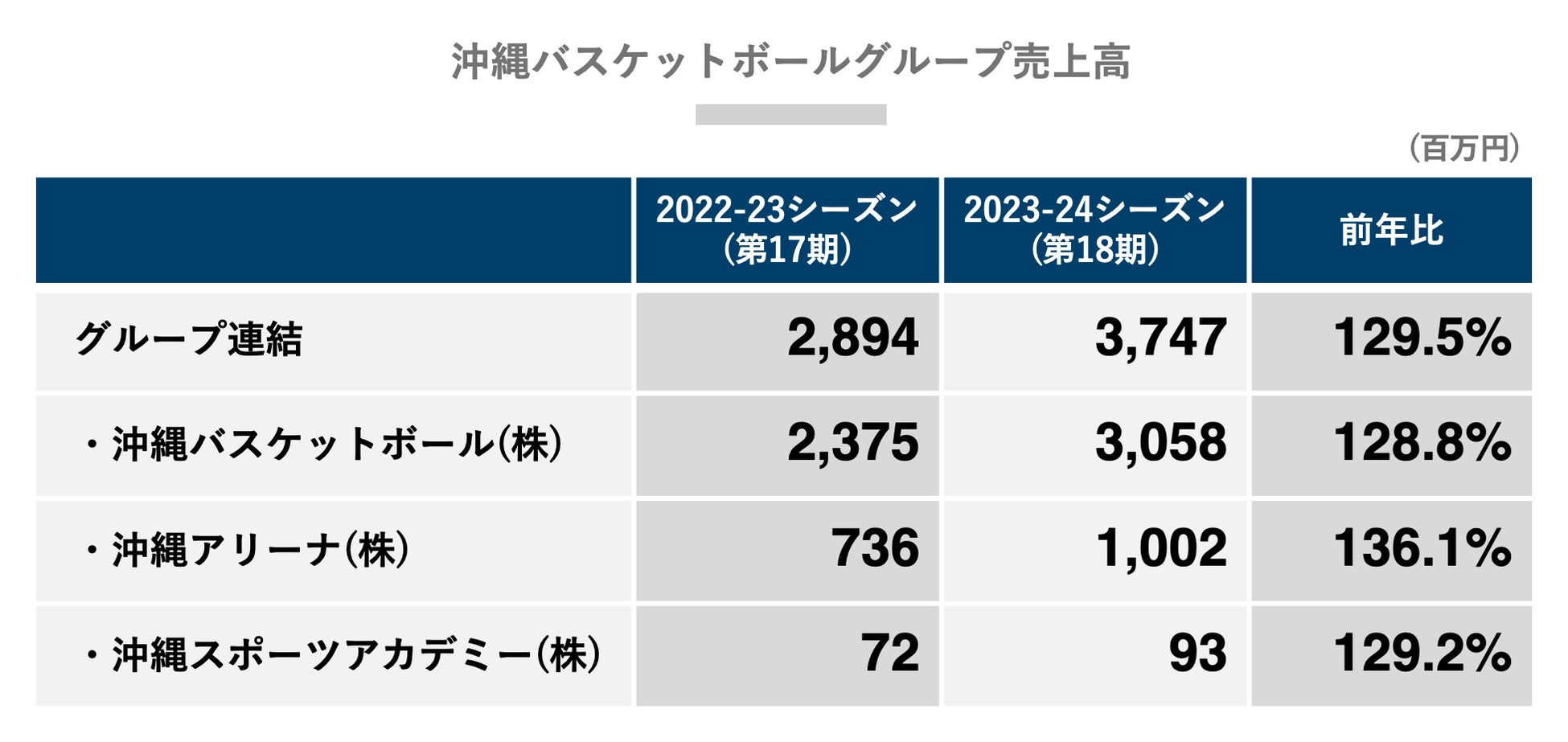 また事業成績においては、沖縄バスケットボール(株)の売上高は3,058百万円(128.8%増)となり、沖縄バスケットボールグループ(沖縄バスケットボール(株)/沖縄アリーナ(株)/沖縄スポーツアカデミー(株)3社)の連結売上高は3,747百万円(129.5%増)と過去最高となりました。