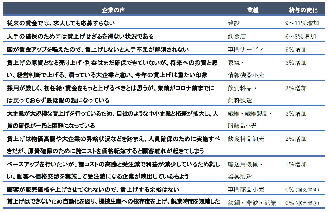 一方で、『据え置き』企業からは、「仕入れや水道光熱費などの固定費が上がっており賃上げどころではない」(専門商品小売)のほか、「売り上げが上がっていないなかでの賃上げは、中小企業にとってかなり厳しいものがある」(その他サービス)のように、資金的余裕が少ない中小企業から賃上げに対して厳しい声があがっていた。