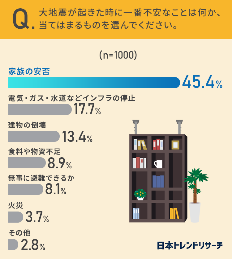 45.4%とおよそ半数近くの方が「家族の安否」がもっとも不安だと回答しています。