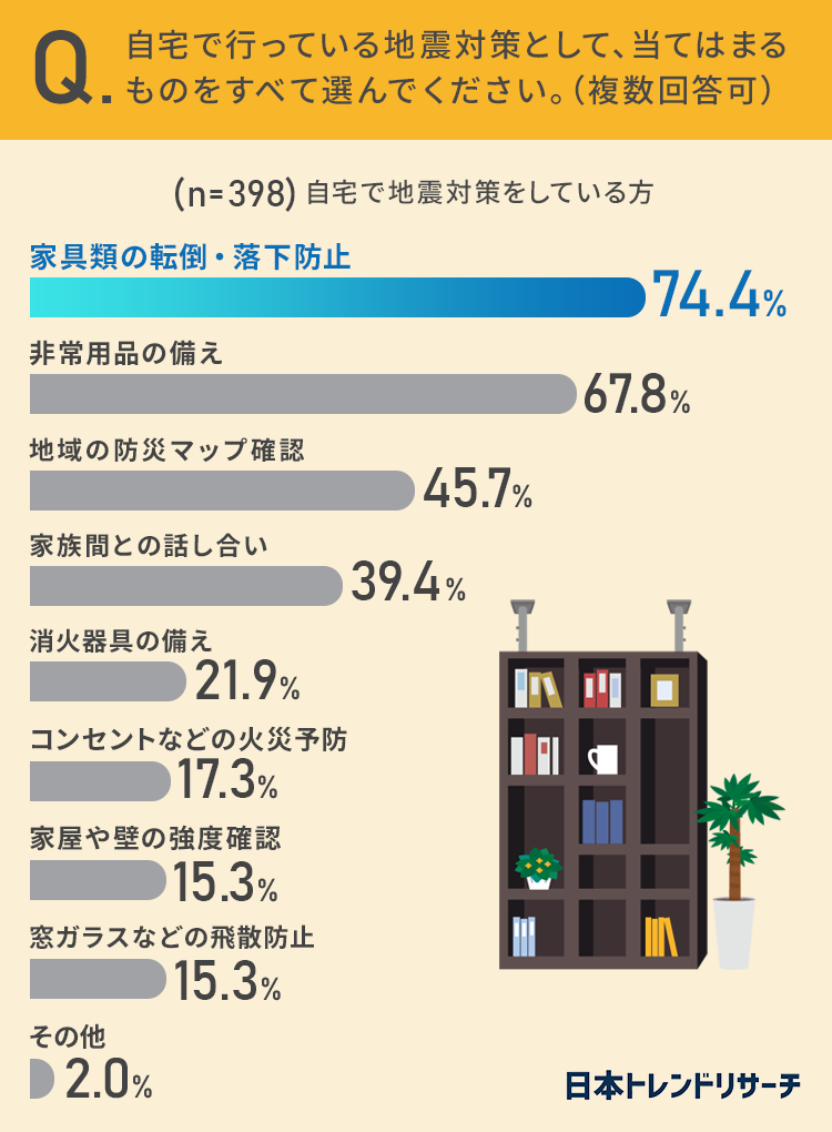 もっとも多かったのが「家具類の転倒・落下防止」で74.4%、次いで「非常用品の備え」が67.8%という結果になりました。