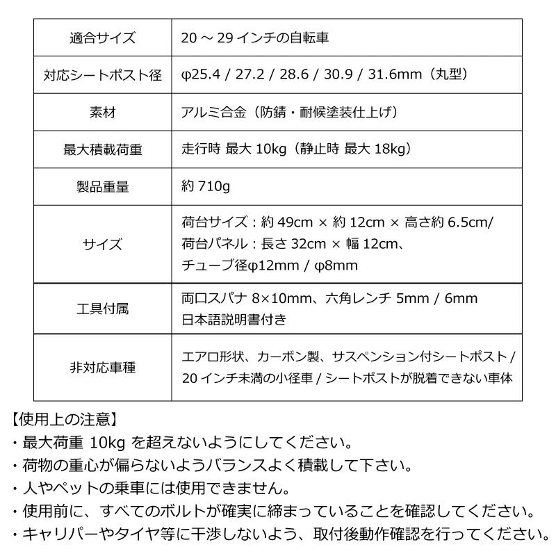 ・最大荷重 10kg を超えないようにしてください。 ・荷物の重心が偏らないようバランスよく積載して下さい。 ・人やペットの乗車には使用できません。 ・使用前に、すべてのボルトが確実に締まっていることを確認してください。 ・キャリパーやタイヤ等に干渉しないよう、取付後動作確認を行ってください。 |