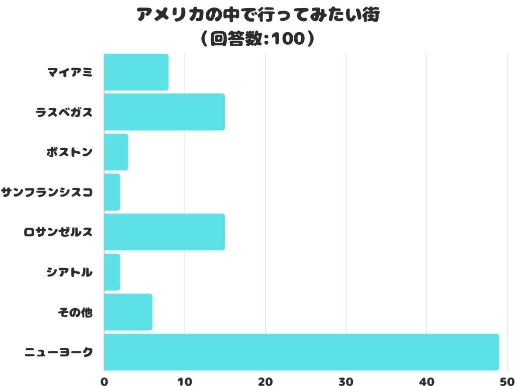 アメリカの中で行ってみたい街をアンケートにて調査したところ、1位は「ニューヨーク」でした。