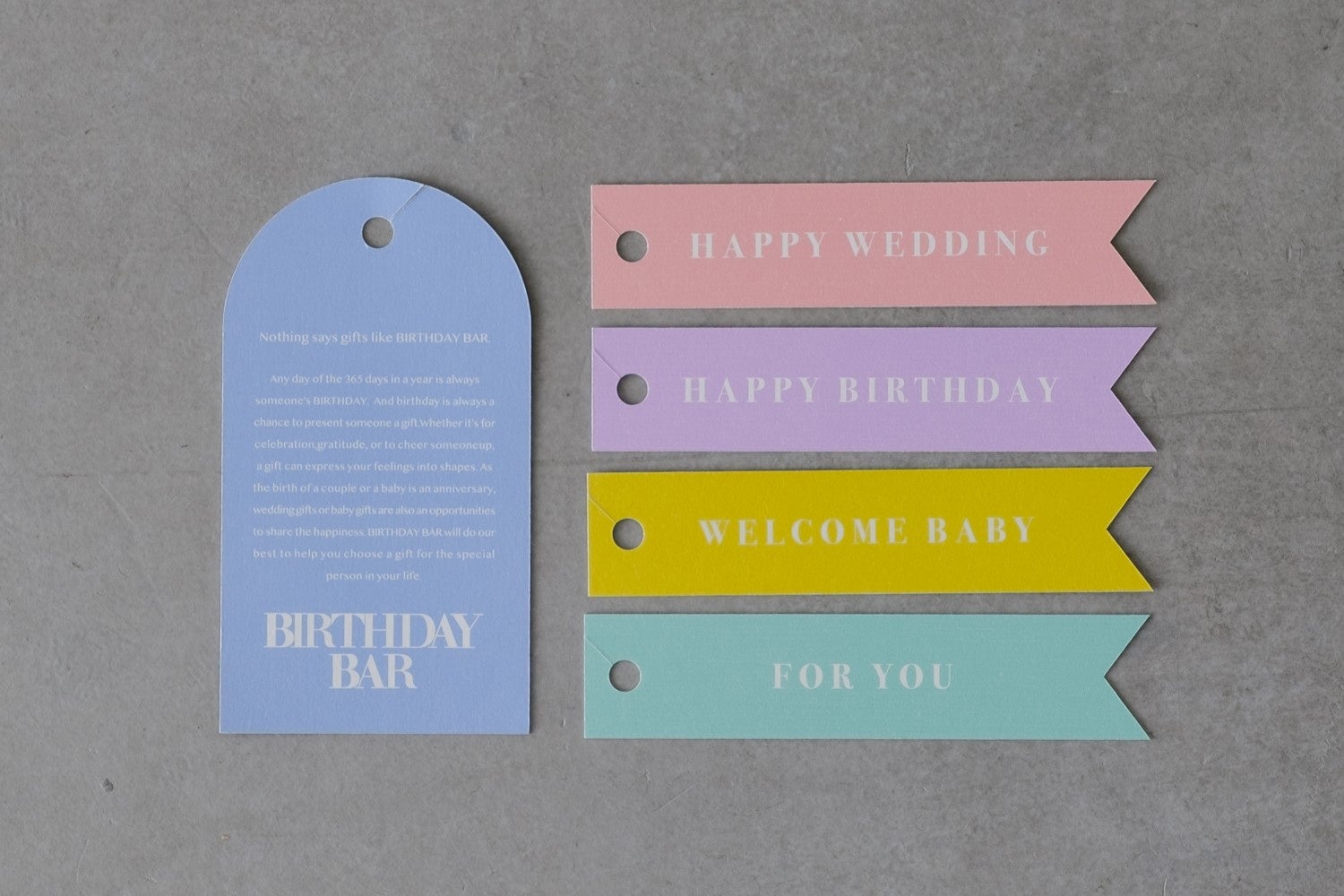 「HAPPY WEDDING」、「HAPPY BIRTHDAY」、「WELCOME BABY」、「FOR YOU」の4種類ご用意しました。今後は、イベントやシーズンに合わせて楽しめるような限定デザインも登場予定です。