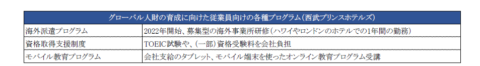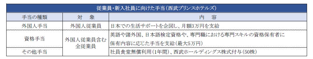 西武プリンスホテルズでは、日本をオリジンとしたグローバルホテルチェーンへの成長に向けて外国人従業員数を現状の2~3 倍にすることを見据え、外国人従業員限定の手当や、外国人従業員を含む全従業員の手当を用意しております。