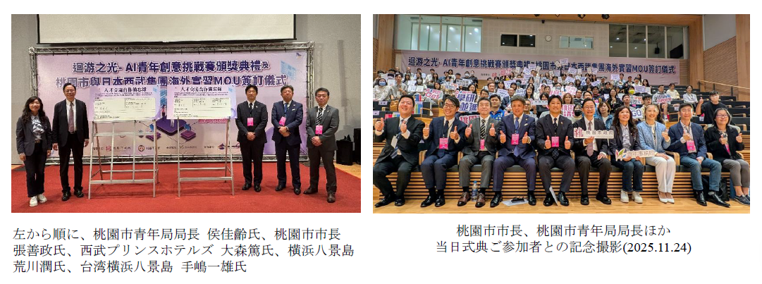 株式会社西武・プリンスホテルズワールドワイド(本社:東京都豊島区南池袋1-16-15 代表取締役社長:金田 佳季、以下:西武プリンスホテルズ)および西武プリンスホテルズのガバナンス子会社である株式会社横浜八景島(本社:神奈川県横浜市金沢区八景島 代表取締役社長:竹口 豊、以下:横浜八景島)は、台湾・桃園市と人財交流に関する基本合意書を締結いたしました。台湾・桃園市からのインターンシップ受入れを強化することで、職場での従業員同士の交流を活性化し、グローバル対応のスキルが高い人財育成の強化を図ります。