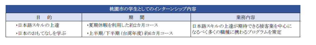 西武プリンスホテルズは、2015年から台湾の大学生インターンシップを約300人受入れており、フロント業務やベル業務、レストランサービスなど接客を中心とした職種に配属し、スキルアップの機会を提供しております。当インターンシップを通じて約30名が社員として入社し、現在も活躍を続けております。