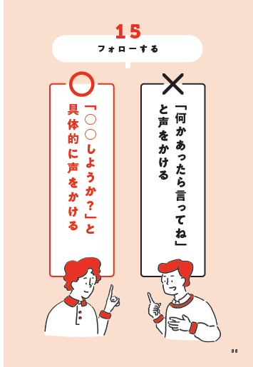 本書で学べるのは、リーダーシップや相手を動かす方法ではなく、あくまで「目下の人とフラットないい関係」を築くための話法です。○×方式で、シチュエーション別に48の会話のコツを紹介していきます。