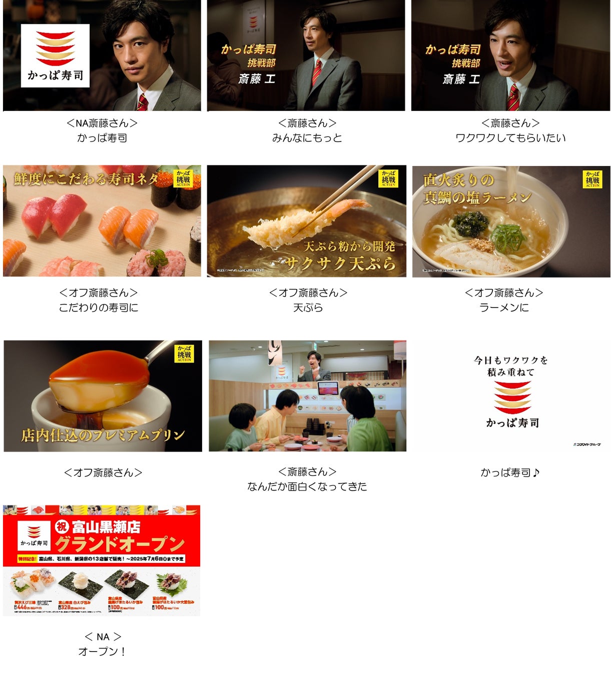 ・内容:かっぱ寿司の“挑戦部”社員と扮する俳優の斎藤工さんが、長年お客様にも人気があり、かっぱ寿司としても自信をもってご提供している定番商品でもっと「ワクワク」をお届けするために奮闘する姿が描かれています。