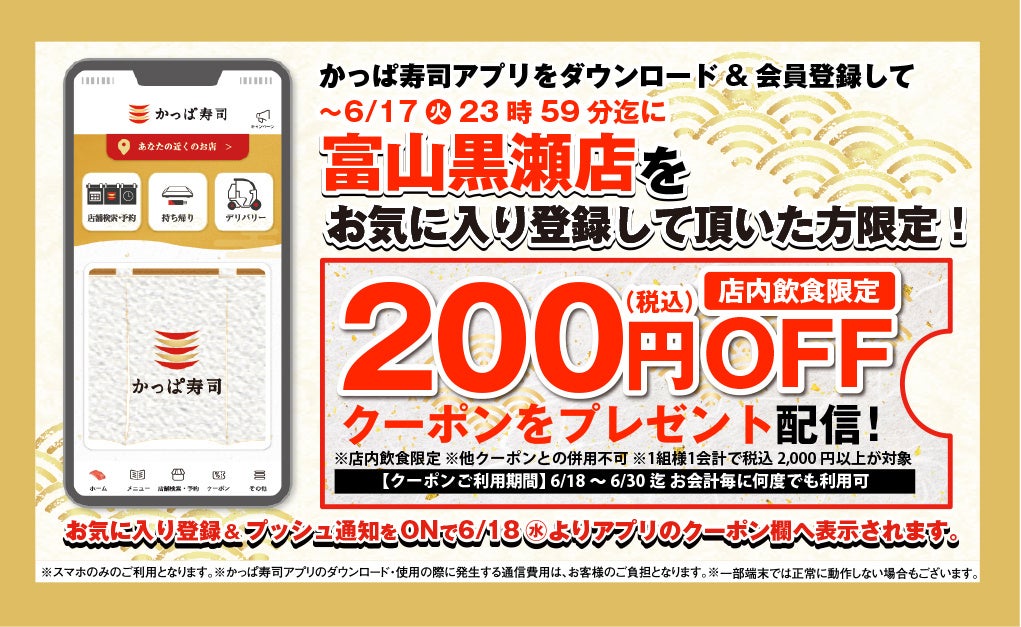 公式アプリ(https://www.kappasushi.jp/support/app)をダウンロード&会員登録いただき、6月17日(火)23時59分までに『富山黒瀬店』をお気に入り登録いただくと、6月18日(水)から6月30日(月)まで、お会計毎に何度でもご利用いただける“店内飲食限定200円(税込)OFFクーポン”をプレゼント配信いたします。