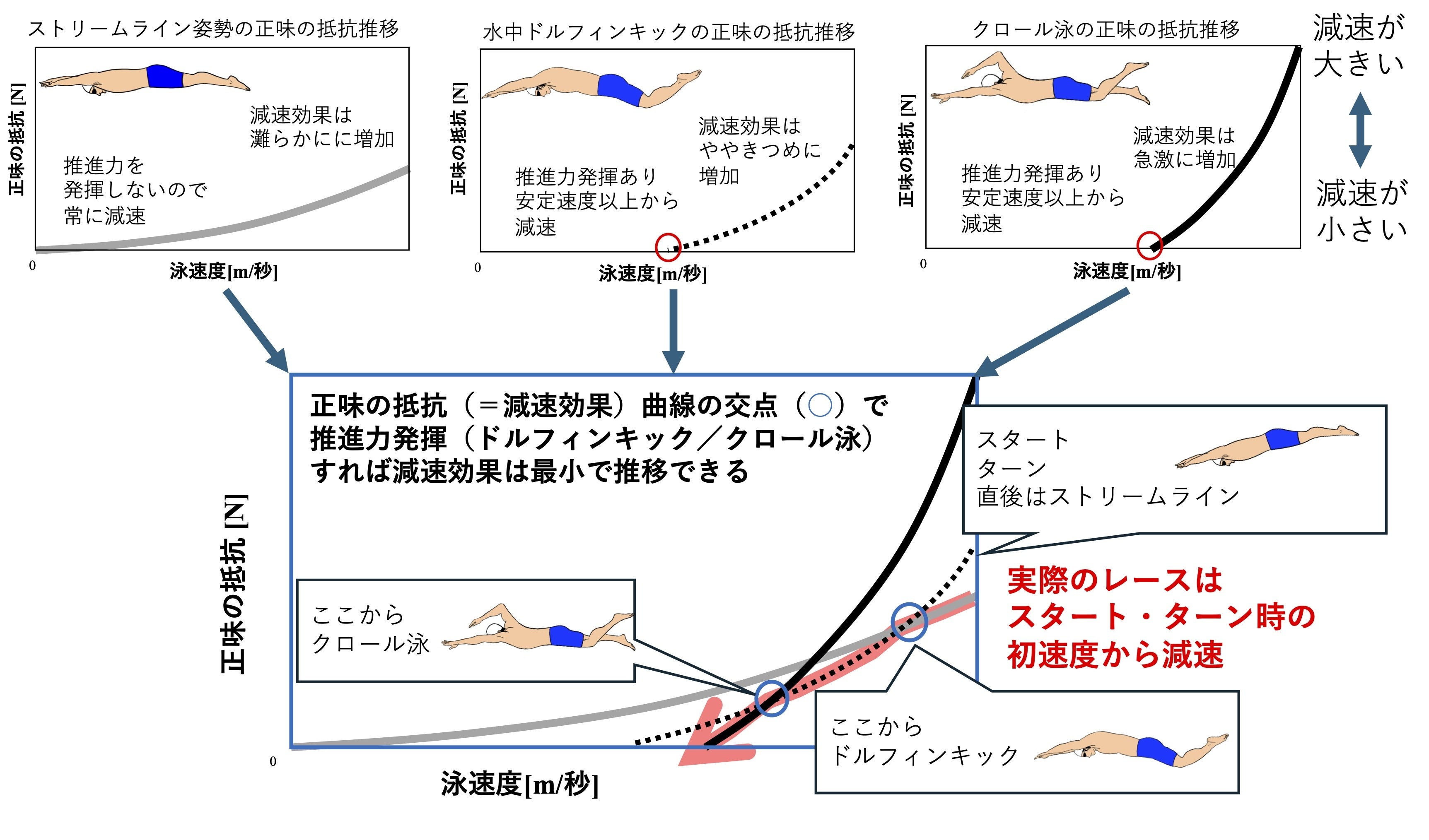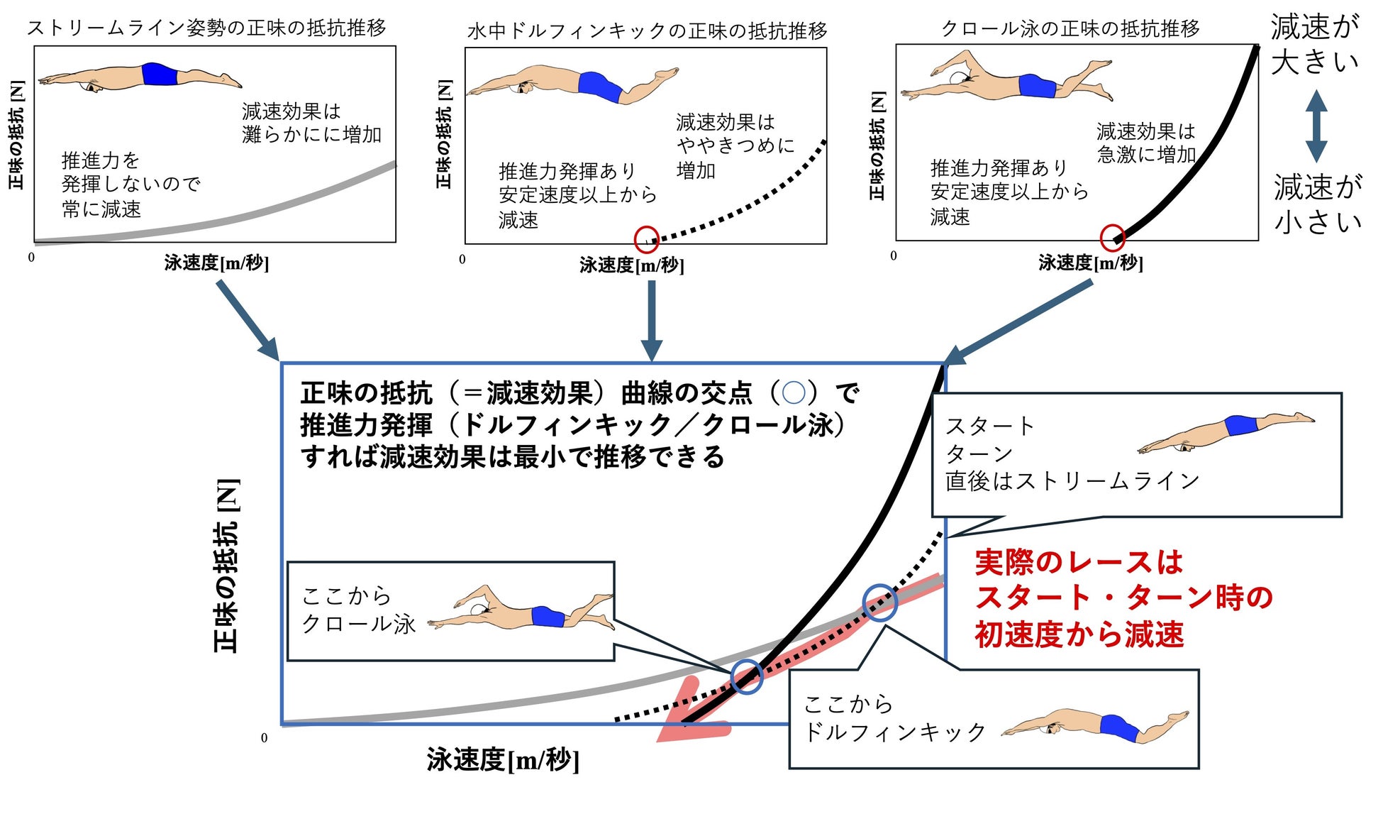 ストリームライン姿勢、水中ドルフィンキック、クロール泳の3つの姿勢・動作について、高速度域の正味の抵抗曲線(推進力によって相殺される減速効果量)が明らかになった。これらの曲線の交点で推進動作(水中ドルフィンキック/クロール泳)を開始することで減速効果の最小化が実現できる。