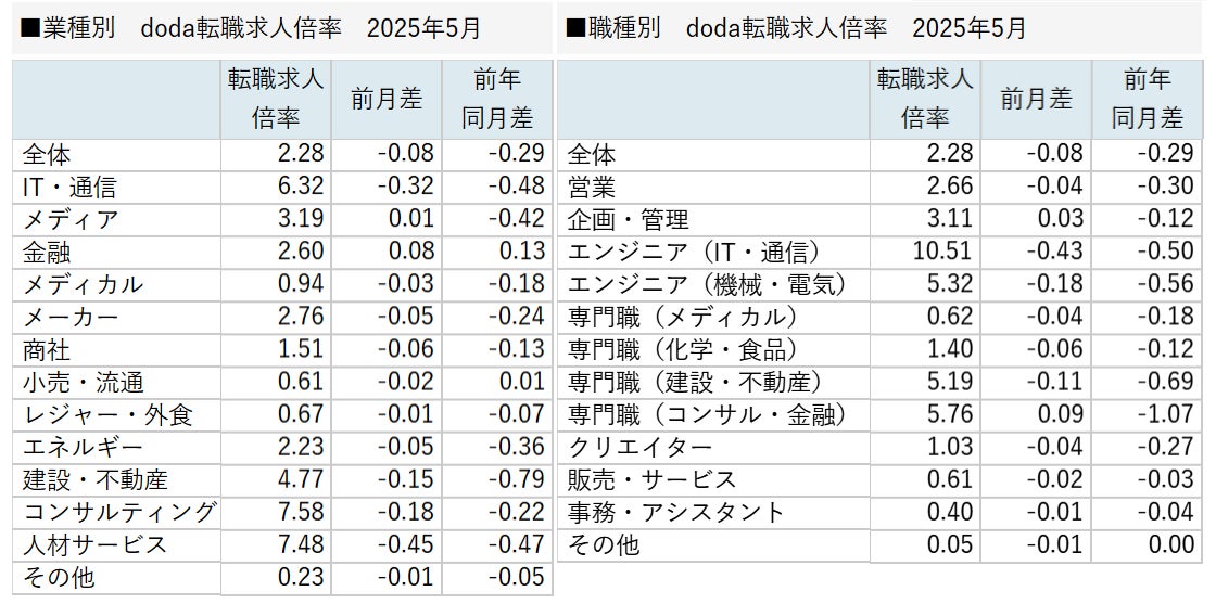 doda転職求人倍率 2025年5月は2.28倍(前月差-0.08ポイント)