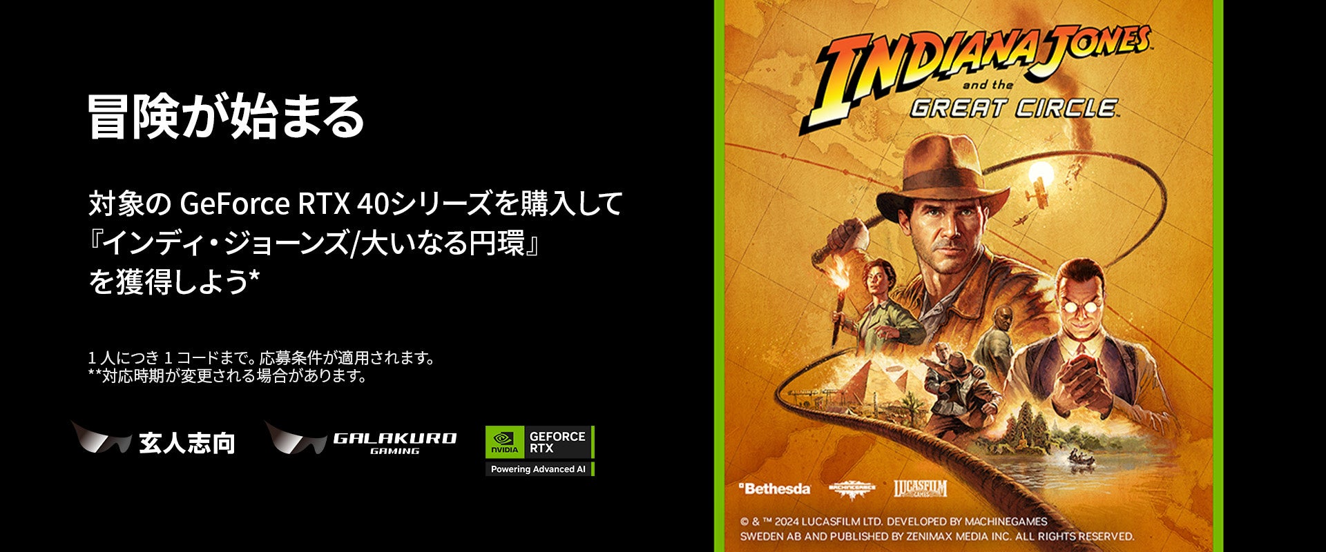 期間中、玄人志向 / GALAKURO GAMINGの指定グラフィックボードをご購入いただき、お申込みいただきますと、PCゲーム『インディ・ジョーンズ/大いなる円環』がもらえるキャンペーンを開催します。