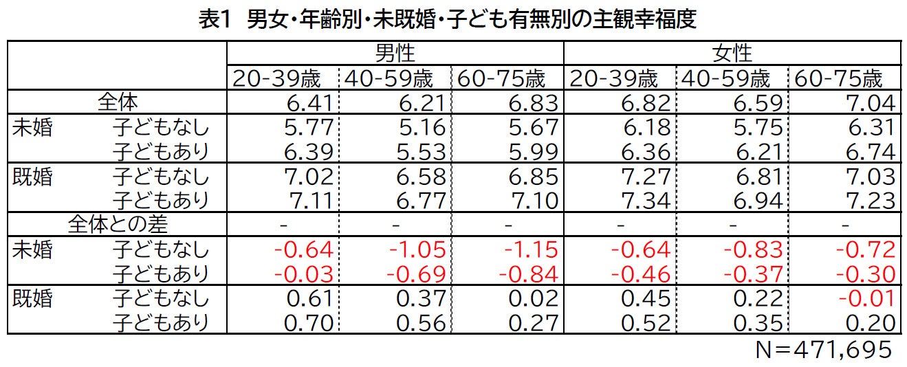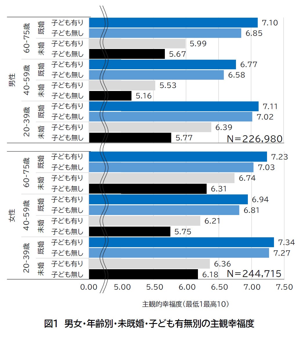 幸福度の平均値を比較すると男女ともに、全年齢で結婚しているほうが、子どもがいるほうが幸福度が高くなっています。最も幸福度が高いのは結婚していて子どもがいる20歳から39歳の女性で幸福度は7.34(1が最低、10が最高の10段階)、最も幸福度が低いのは未婚で子どもがいない40歳から59歳の男性で幸福度は5.16となっています。