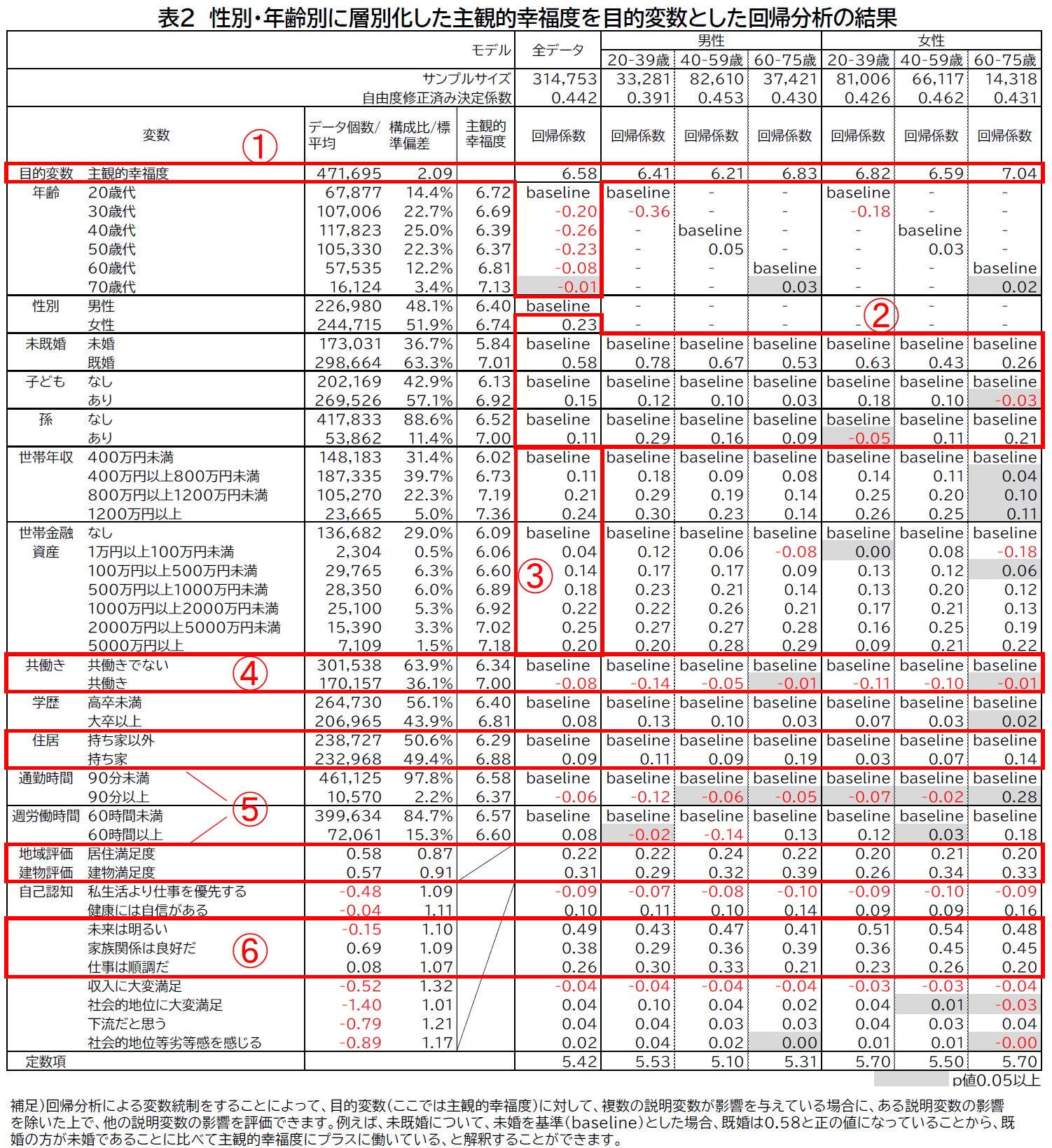 ●女性は男性よりも幸福度が高く、さらに男女とも結婚している、子どもがいる、孫がいると幸福度が高くなるようです。特に男性の結婚による幸福度への影響は大きいといえそうです(表2-②)。