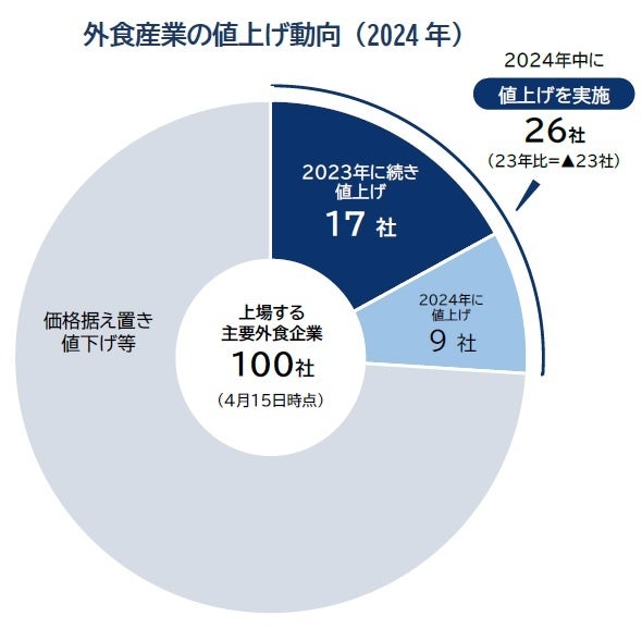 上場する外食主要100社における、2024年の価格改定計画(値上げ、実施済み含む)を調査した結果、4月15日までに値上げを表明したのは26社だった。値上げが本格化した22年(58社)に比べて約4割の水準にとどまったほか、23年(49社)からも半減した。