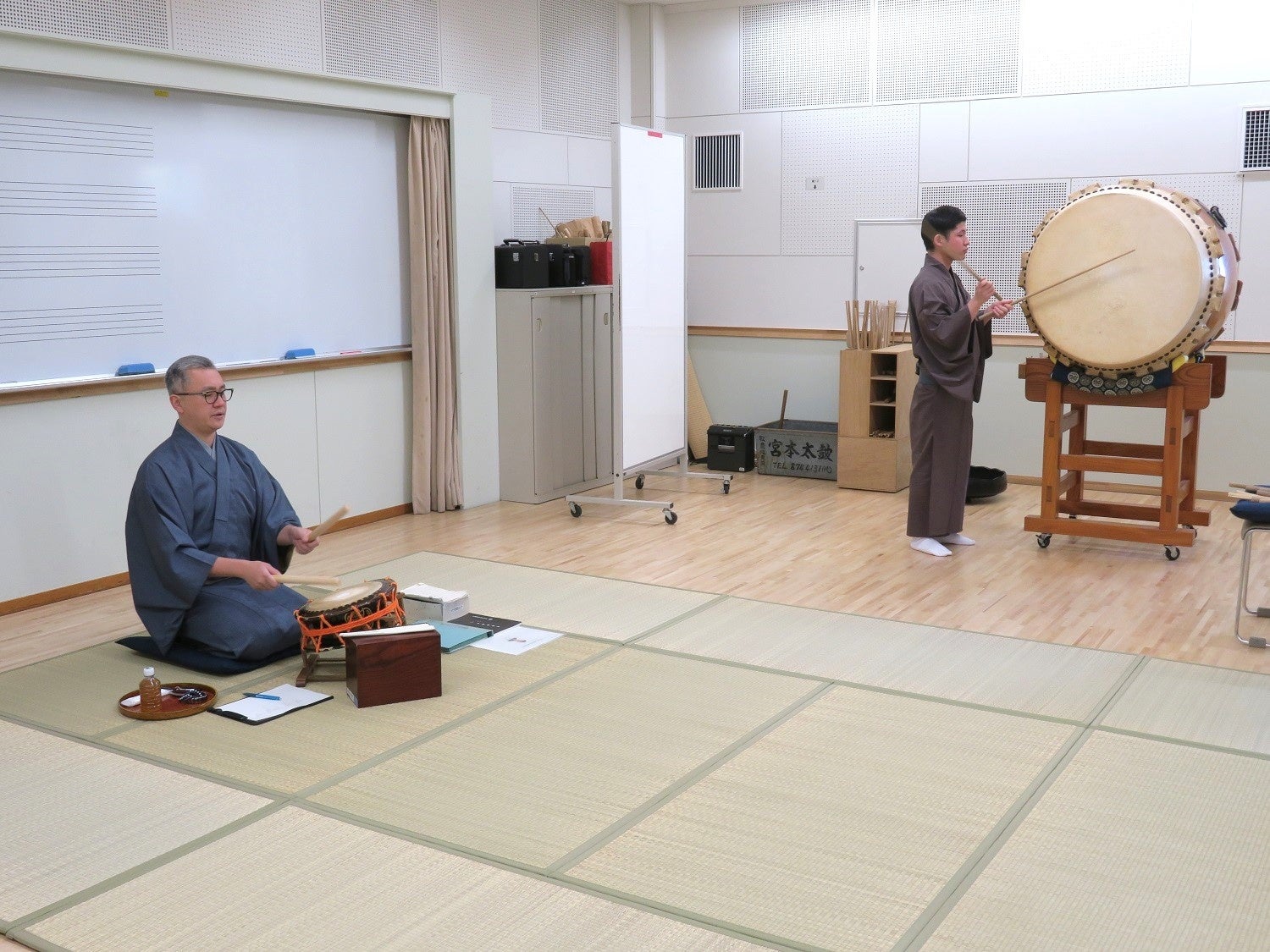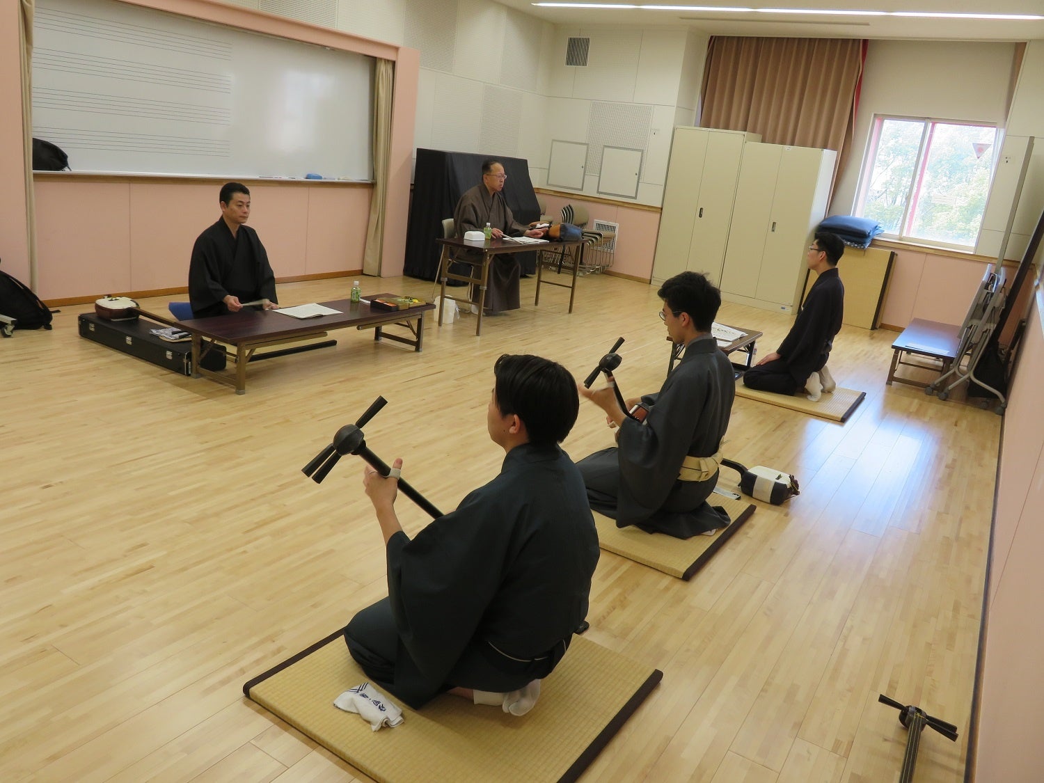 研修課程では、小鼓・大鼓・太鼓・大太鼓・笛の演奏法を学び、鳴物演奏者に必要な技芸や知識を習得します。