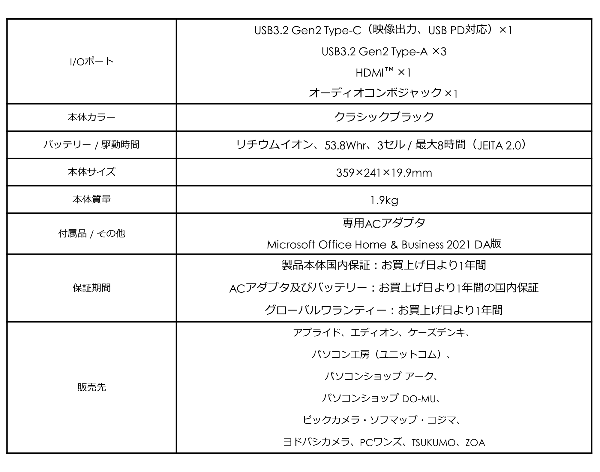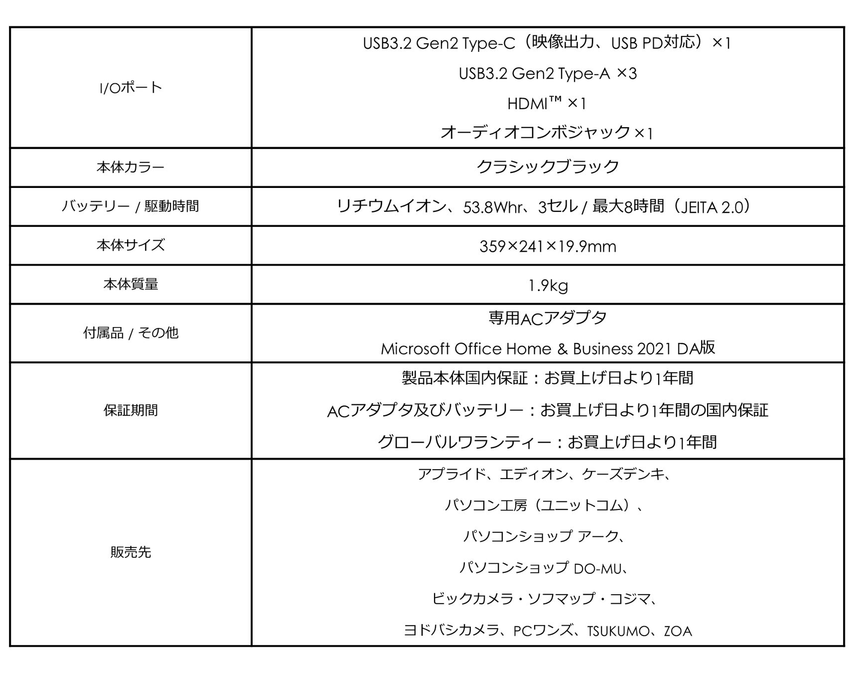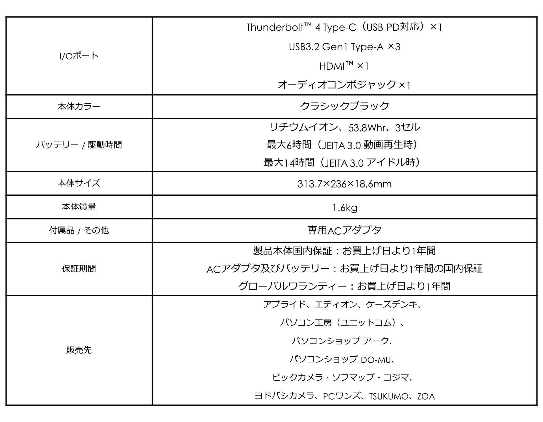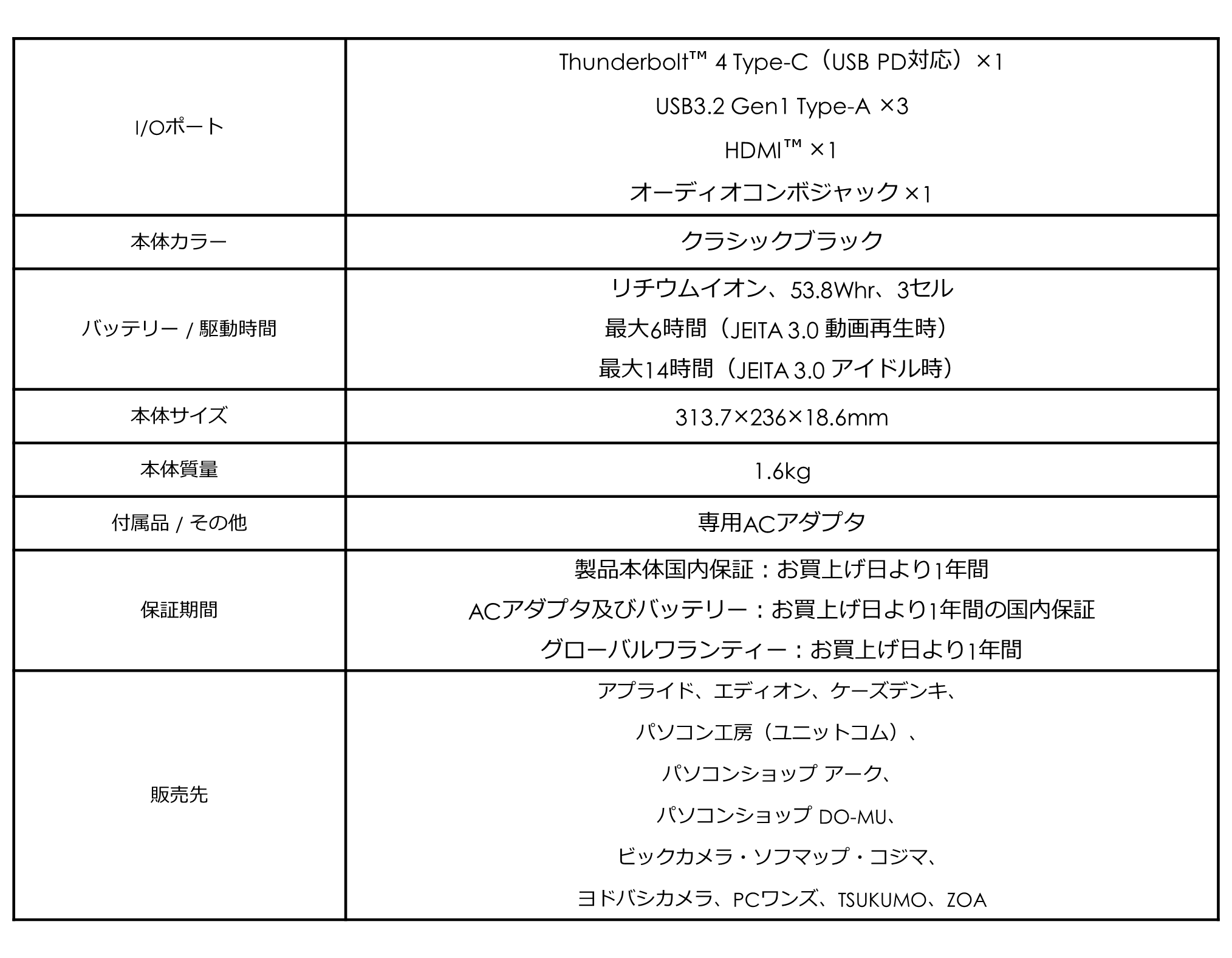 CPU性能の向上だけでなく、機能面でも改良を加えております。Webカメラ部分に盗撮を防止するプライバシーシャッターを搭載。USB Type-Cは映像出力とUSB PDとDisplayPort Alt Modeに対応したUSB 3.2 Gen2 Type-Cを採用。Type-Aも高速データ転送が可能なUSB 3.2 Gen2 Type-Aを3ポート搭載。高速タイプ無線LAN「Wi-Fi 6E」採用など妥協のない仕上がりとなっています。