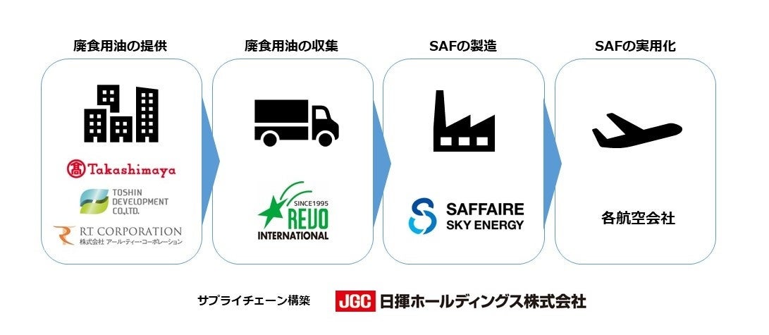 株式会社高島屋(本社:大阪市中央区、代表取締役社長:村田善郎、以下「高島屋」)および同社連結子会社である東神開発株式会社(本社:東京都世田谷区、代表取締役社長:倉本真祐、以下「東神開発」)、株式会社アール・ティー・コーポレーション(本社:東京都中央区、代表取締役社長:髙田明宏、以下「RTC」)は、日揮ホールディングス株式会社(代表取締役会長 CEO:佐藤雅之、以下「日揮HD」)、株式会社レボインターナショナル(代表取締役 CEO:越川哲也、以下「レボインターナショナル」)、並びに合同会社SAFFAIRE SKY ENERGY(代表職務執行者:秋鹿正敬、以下「SAFFAIRE SKY ENERGY」)と、国産の持続可能な航空燃料(Sustainable Aviation Fuel、以下「SAF」)の原料となる使用済み食用油(以下「廃食用油」)の継続的な供給および、その利用に関する基本合意書を9月30日付で締結しました。併せて、SAFを飛行機の燃料とするプロジェクト「Fry to Fly Project」にも参画いたします。