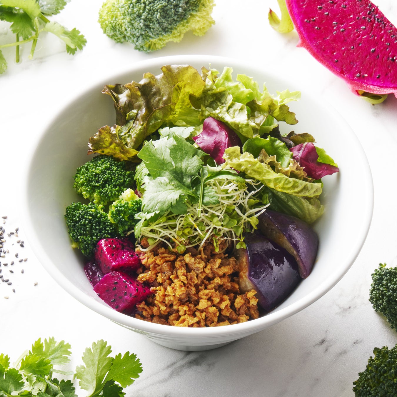今年の冷やし黒胡麻たんたん麺は、7種の野菜をたっぷり使ったサラダ仕立てのらーめんです。スーパーフードといわれるブロッコリースプラウトやドラゴンフルーツ(※)のほか、グリーンリーフ、サニーレタス、トレビス、ブロッコリーに爽やかな揚げ茄子のマリネを加え、香り高い香草(パクチー)を添えています。
