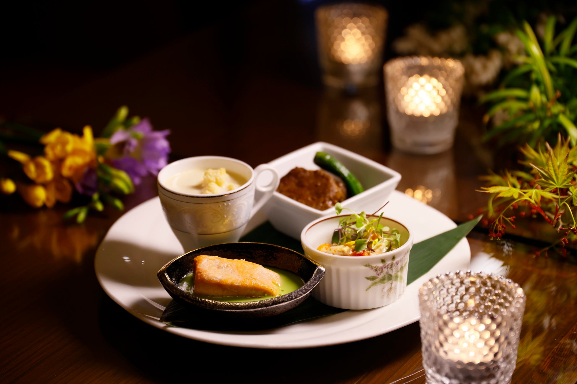 ・合鴨ロースのスモーク 抹茶風味のチーズソース ・炙りトラウトサーモン ヨーグルトドレッシング ・本日のポタージュ ・サクラマスのムニエル空豆のソース ・サイコロステーキ有馬山椒の照焼ソース ・オマール海老と帆立貝柱のソテー ノルマンディーソース