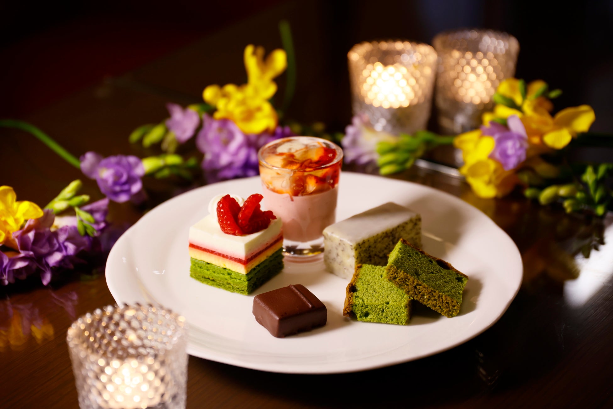 緑、赤、ピンクなど色とりどりのスイーツは、初夏の兆しを感じる季節に最適な爽やかな味わいの5品をご提供いたします。「ホワイトチョコとお茶のムース」は奈良県月ヶ瀬にあるティーファーム井ノ倉の抹茶を使用し、抹茶の上品な甘みとラズベリーの酸味が融合した初夏の訪れを感じられる一品です。