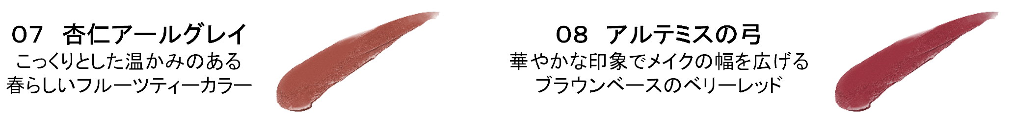 春らしいフルーツティーのようなコーラル系と、華やかなブラウンベースのベリーレッド系の2色。