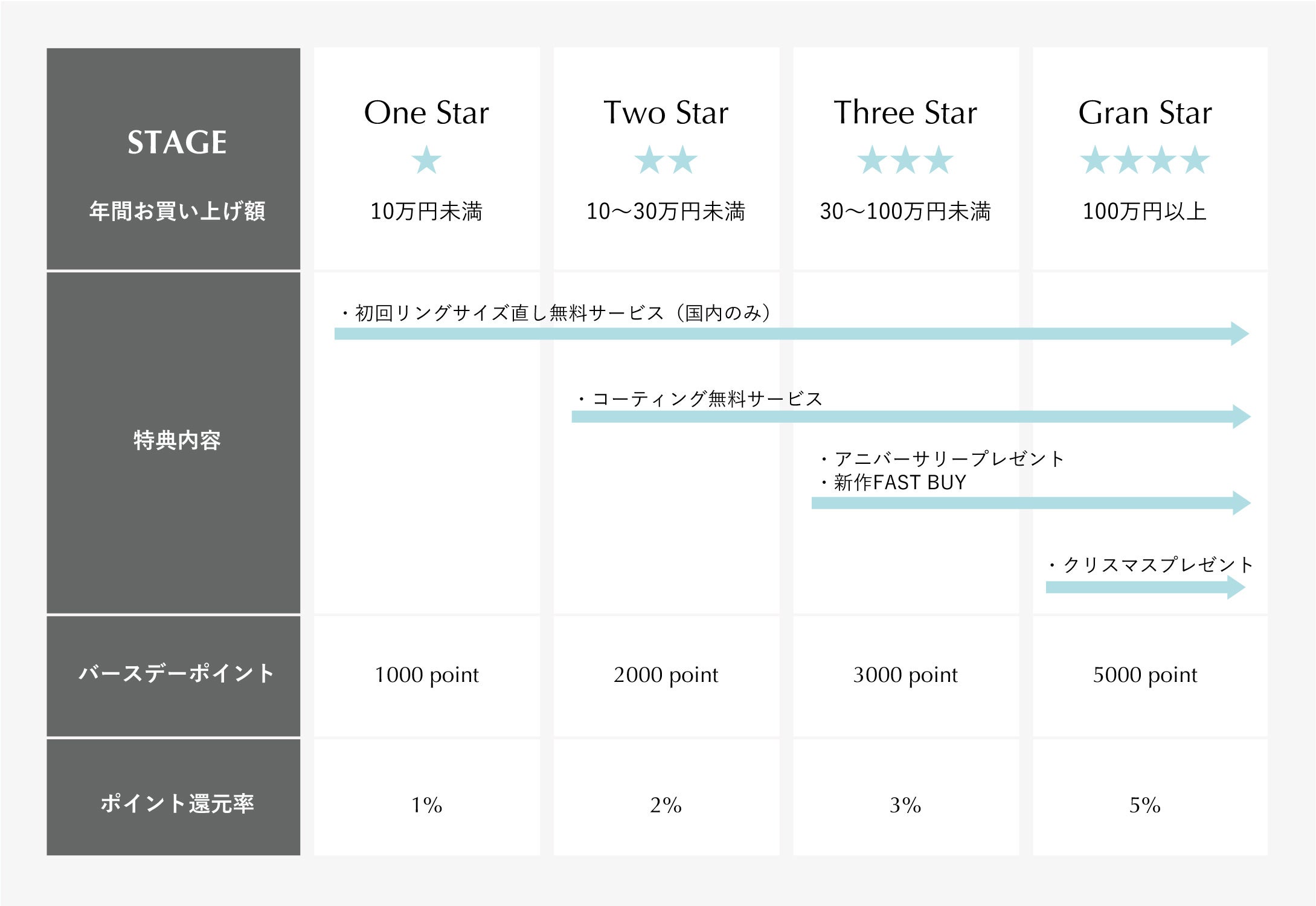 年間ご購入金額によって決まる会員ステージに応じて、「新作ジュエリーの先行予約権」や「限定・非売品のプレゼント」など、さまざまな特典をご提供いたします。