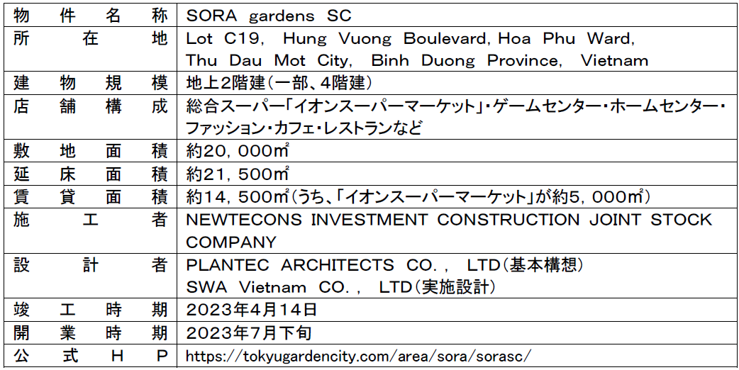 ビンズン新都市の玄関口となる「SORA gardens」エリアに位置する本施設では、「暮らしにさらなる彩りを」をコンセプトに、物販・飲食・エンターテインメントが楽しめます。本施設は、ビンズン新都市周辺に住む・働く・訪れる方々をターゲットとしており、イオン、キッズーナ、モーリーファンタジー、コーナンジャパン、ABCマート、MUJIなどの日系テナントが入居します。