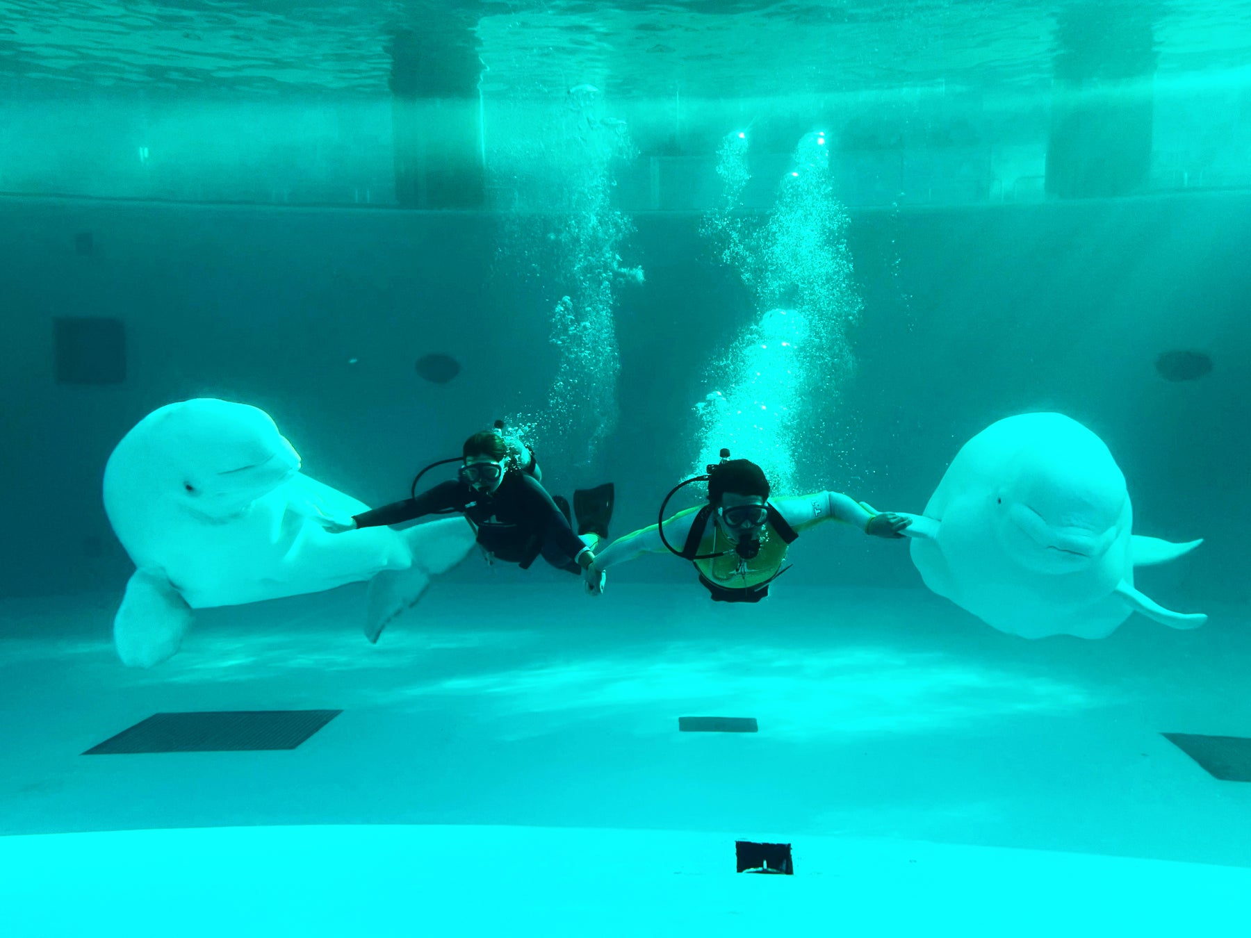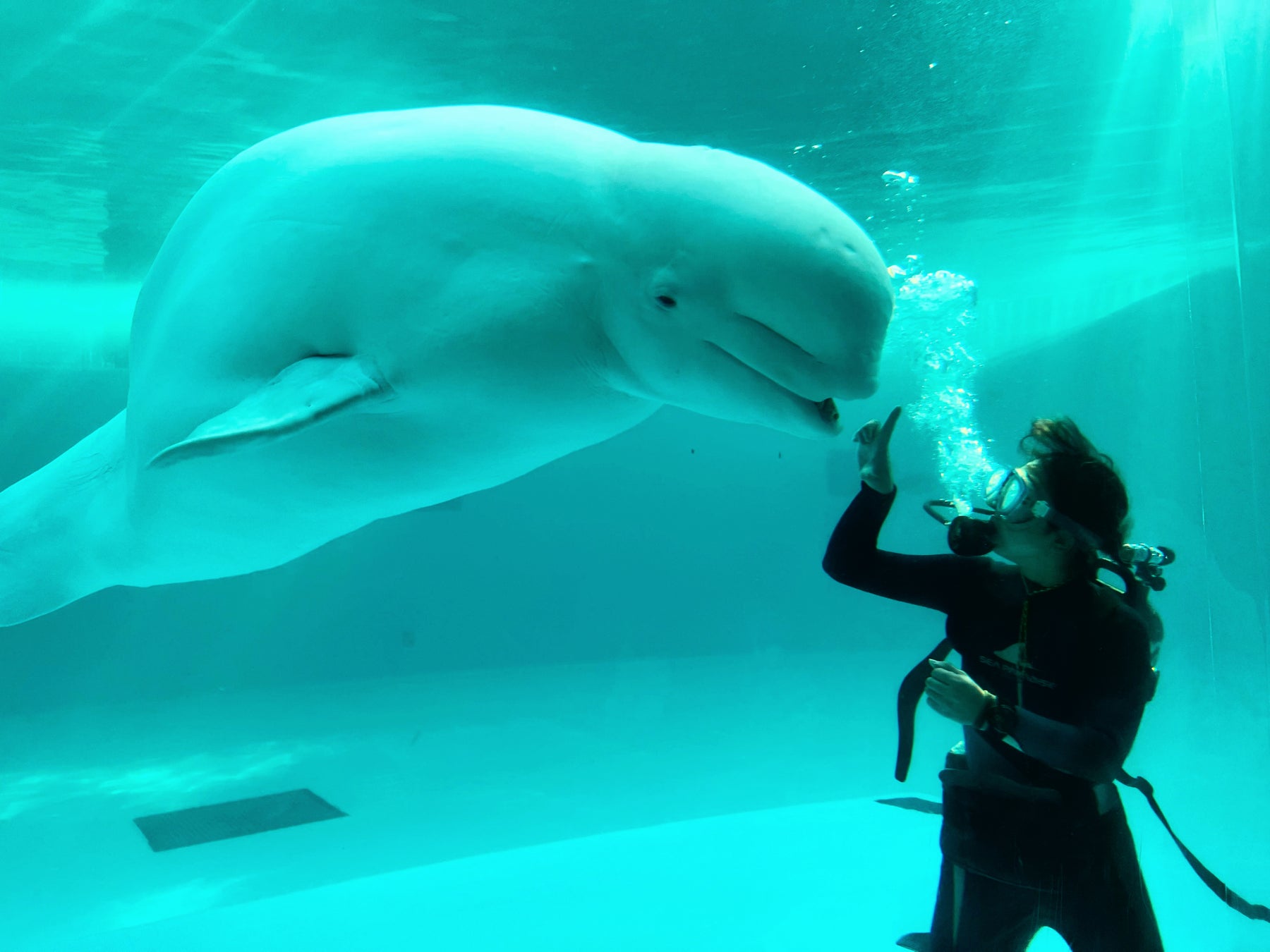 今しか見ることができないシロイルカとトレーナーによる息の合った水中パフォーマンスをお楽しみください。