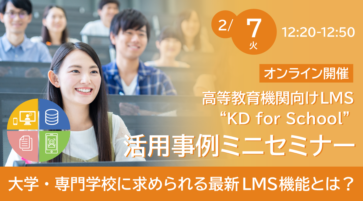 大学・専門学校に求められる最新LMS機能とは? “KD for School”活用事例ミニセミナー《1/17(火)・2/7(火)昼 オンライン開催》高等教育機関向けLMSをご紹介!