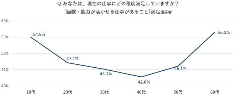 「経験・能力が活かせる仕事があること」について、「満足」と答えた割合が最も少なかったのは40代で42.8%だった。一方で、「満足」と答えた割合が最も高かったのは60代で56.5%、次に高かったのは10代で54.9%だった、若年層が高く、ミドル層になるにつれて低下し、シニア層になって回復する傾向が見られた。