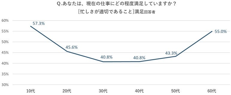 「忙しさが適切であること」について、「満足」と答えた割合が最も少なかった年代は30代、40代でいずれも40.8%という結果だった。一方で、「満足」と答えた割合が最も高かったのは10代で57.3%、次に高かったのは60代で55.0%だった、若年層が高く、ミドル層になるにつれて低下し、シニア層になって回復する傾向が見られた。