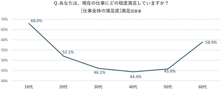 「仕事全体の満足度」について、「満足」と答えた割合が最も少なかった年代は40代で44.4%という結果だった。一方で、「満足」と答えた割合が最も高かったのは10代で68.0%、次に高かったのは60代で58.9%だった。若年層が高く、ミドル層になるにつれて低下し、シニア層になって回復する傾向が見られた。