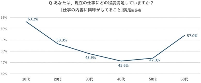 「仕事の内容に興味が持てること」について、「満足」と答えた割合が最も少なかった年代は40代で45.6%という結果だった。一方で、「満足」と答えた割合が最も高かったのは10代で63.2%、次に高かったのは60代で57.0%だった。若年層が高く、ミドル層になるにつれて低下し、シニア層になって回復する傾向が見られた。