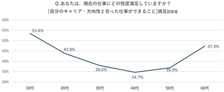 「自分のキャリア・方向性と合った仕事ができること」について、「満足」と答えた割合が最も少なかったのは40代で34.7%だった。一方で、「満足」と答えた割合が最も高かったのは10代で53.4%、次に高かったのは60代で47.3%だった、若年層が高く、ミドル層になるにつれて低下し、シニア層になって回復する傾向が見られた。