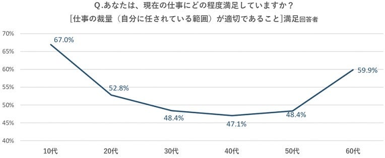 「仕事の裁量(自分に任されている範囲)が適切であること」について、「満足」と答えた割合が最も少なかった年代は40代で47.1%という結果だった。一方で、「満足」と答えた割合が最も高かったのは10代で67.0%、次に高かったのは60代で59.9%だった、若年層が高く、ミドル層になるにつれて低下し、シニア層になって回復する傾向が見られた。