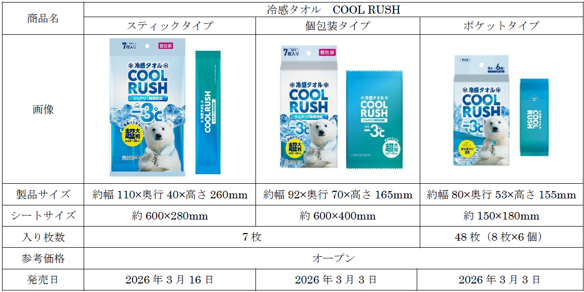アイリスオーヤマ株式会社(本社:宮城県仙台市、代表取締役社長:大山 晃弘)は、使い方に合わせてシートサイズやパッケージ仕様を選べる「冷感タオル COOL RUSH(クールラッシュ)」シリーズ3種類を、2026年2月27日より全国のドラッグストアやホームセンター、インターネットサイトを中心に順次発売(※1)します。